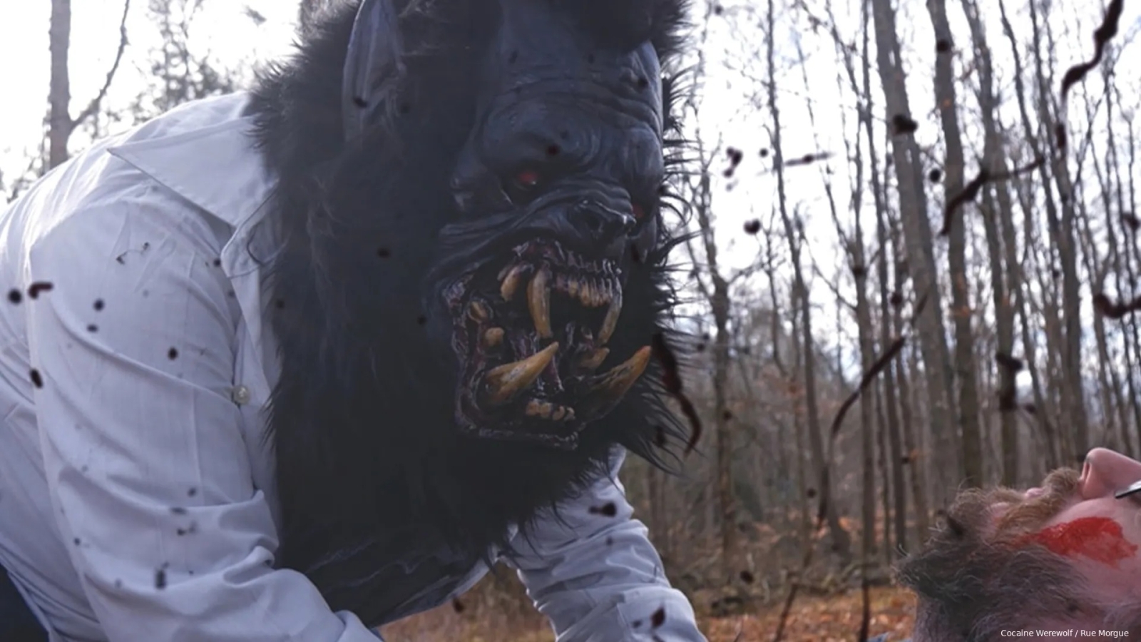 “In COCAINE WEREWOLF, cocaine, cash and a crew filming a low-budget horror movie in the eerie woods of northern Pennsylvania clash when an unexpected visit from a bloodthirsty werewolf literally enters the picture–with deadly results!”