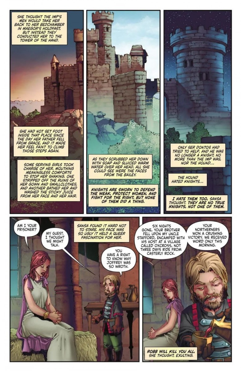 George R. R. Martin’s A Song of Ice and Fire saga continues in the official comic book adaptation by Dynamite Entertainment! Following the events of A Game of Thrones, Westeros is embroiled in civil war, while Daenerys Targaryen — as heir to the Targaryen dynasty, seeks to reclaim the Iron Throne. Arya, with the help of Yoren, a brother of the Night’s Watch, has escaped from King’s Landing, but the road to the Wall brings its own dangers. Meanwhile, Sansa attends a tournament on the sadistic King Joffrey’s name-day, and Bran, in Winterfell, suffers from strange dreams of wolves…
