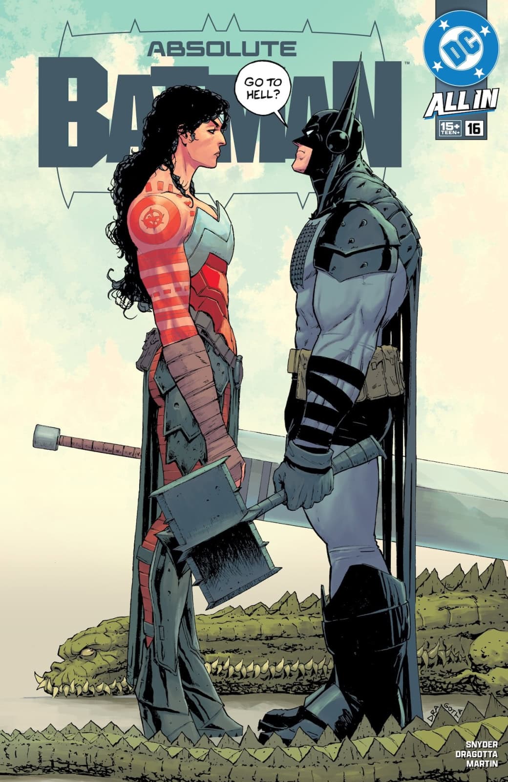 ABSOLUTE BATMAN IN HELL! Part two of our Absolute Batman/Absolute Wonder Woman story — Bruce Wayne is on a desperate hunt to help his friend Waylon, now transformed into a monstrous crocodile roaming the sewers, consumed with a deadly hunger. Batman’s last option for a cure is to turn to a god for help… but will he have to descend into the depths of hell to get it?