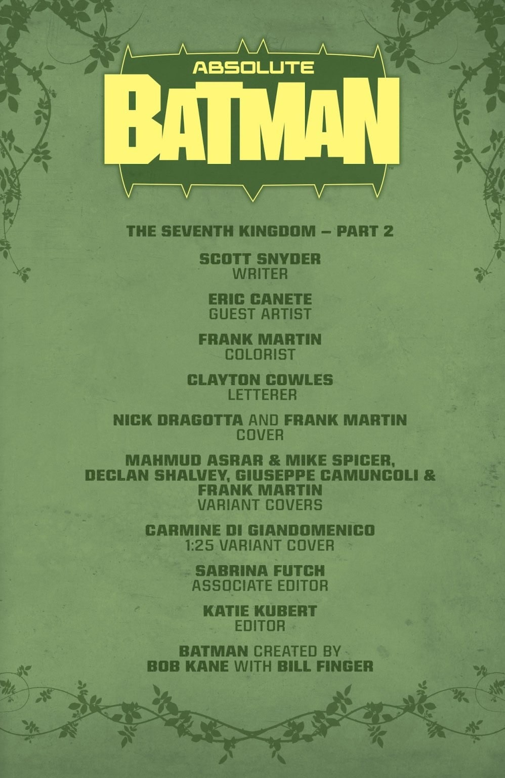 ABSOLUTE IVY’S TENDRILS CONTINUE TO INFECT GOTHAM CITY! After the explosive reveal ending last issue, and Batman continues to fight Poison Ivy’s mutated monsters and winds up uncovering an even more gruesome horror that has embedded itself in the city’s very foundations. All while the Joker’s machinations start to coalesce in a partnership with a new ally.