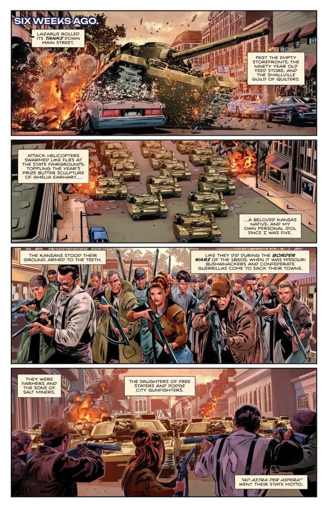 The Battle of Kansas has begun as the tanks of Lazarus Corp come rolling down the streets of Smallville. Haunted and weakened from the horrors he suffered at the hands of Brainiac and Ra’s al Ghul, Superman wages a last desperate fight for everything and everyone he has come to hold dear!