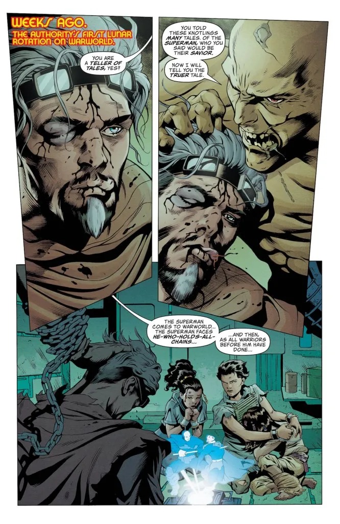 REMATCH! Superman puts what he’s learned on Warworld to the test as he faces Mongul’s unstoppable, reanimated warrior known as the Unmade. But it may be too late for Mongul to salvage his empire before an ancient prophecy is fulfilled. One of Superman’s inner circle will fall, another will be resurrected at a terrible cost, and the Authority’s traitor will be revealed in the conclusion to part one of the Warworld Saga!