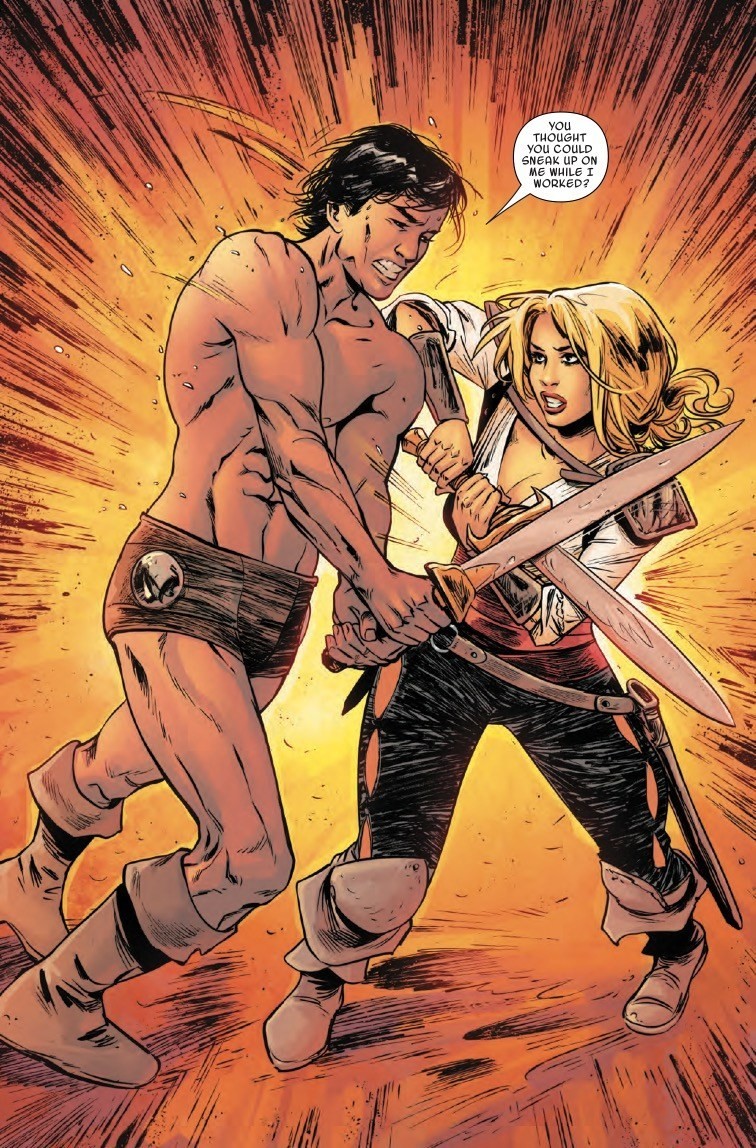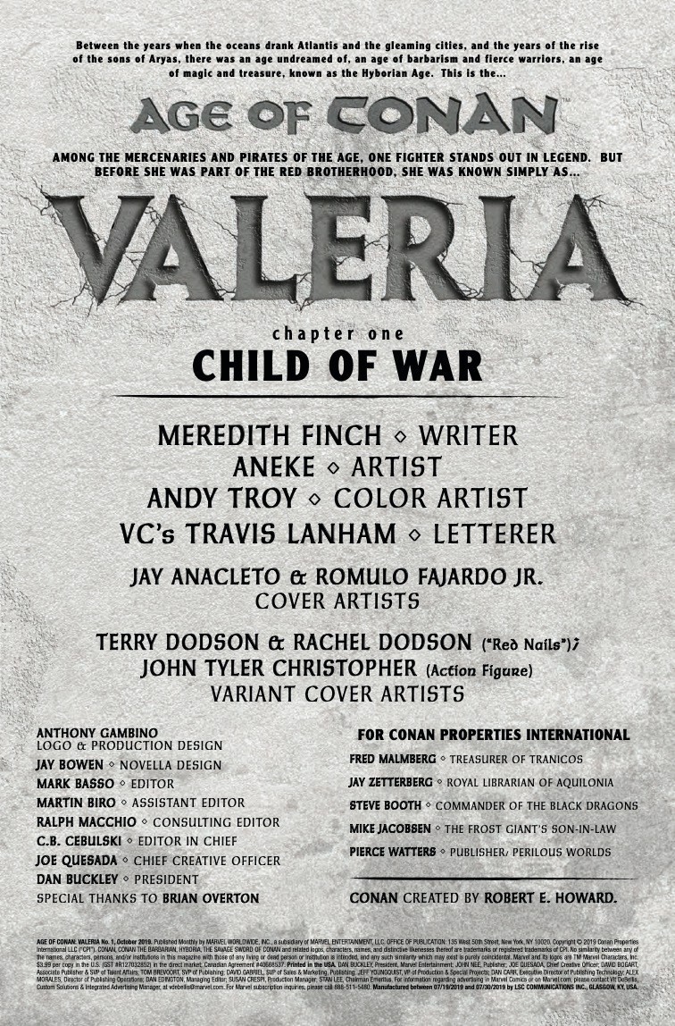 Journey into the Hyborian Age with Valeria, the hero from Robert E. Howard’s classic CONAN story “Red Nails,” on an all-new quest set before the fan-favorite tale! Before her careers as a pirate and mercenary and before she crossed paths with the Red Brotherhood and the likes of Conan of Cimmeria, Valeria was a young woman from Aquilonia, seeking justice for a crime gone unpunished. But as the formidable Valeria makes her way in this world, proving her capability against those who doubt her abilities as a young woman, she will find more than she bargained for in her thirst for revenge. Her deadly fighting skills will be put to the test and her trust will be shaken as she hunts her brother’s killer and comes into her own as a force to be reckoned with in the Hyborian Age! Don’t miss the start of an all-new classic, from Meredith Finch (Wonder Woman, SAVAGE SWORD OF CONAN) and Aneke (Red Sonja, DC’s Bombshells)! Plus: The first chapter of an all-new novella featuring one of CONAN’s greatest nemeses – the wizard THOTH-AMON!