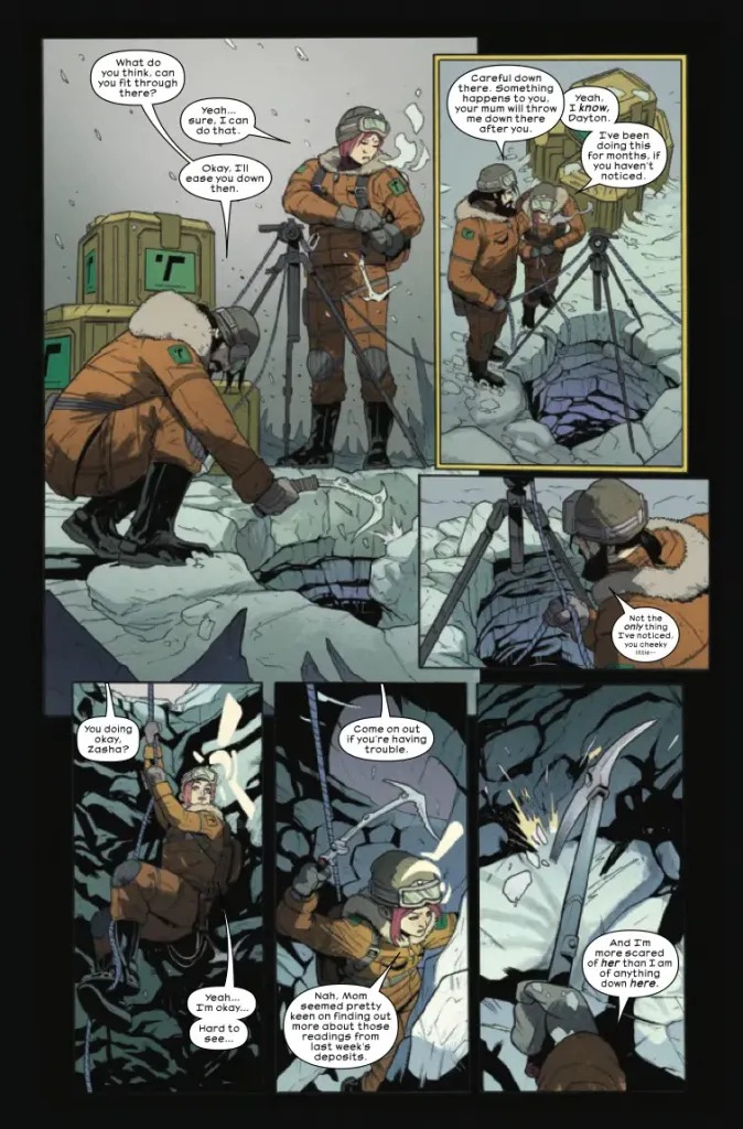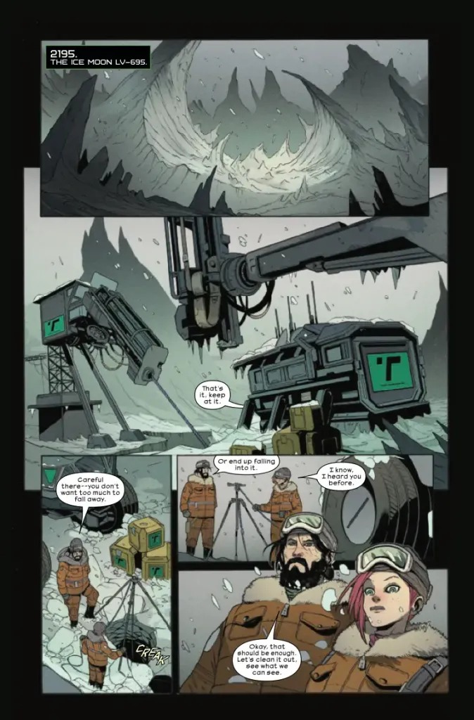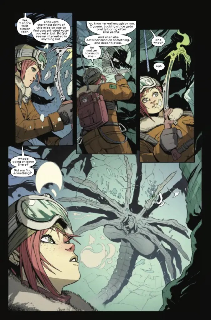 SUPERSTARS DECLAN SHALVEY & ANDREA BROCCARDO TAKE ALIEN TO BONE-CHILLING NEW DEPTHS! Scientist Batya Zahn will do just about anything to get her family off the icy moon where they’ve been conducting research on water conservation. But there’s more than glacial springs to find in this forgotten corner of the galaxy. When they discover an extraordinary organism buried in the ice, it won’t take long for tensions to heat up. What is hidden in the snow comes forth in the thaw…and no one will be welcoming this spring. A new era of Alien starts here!