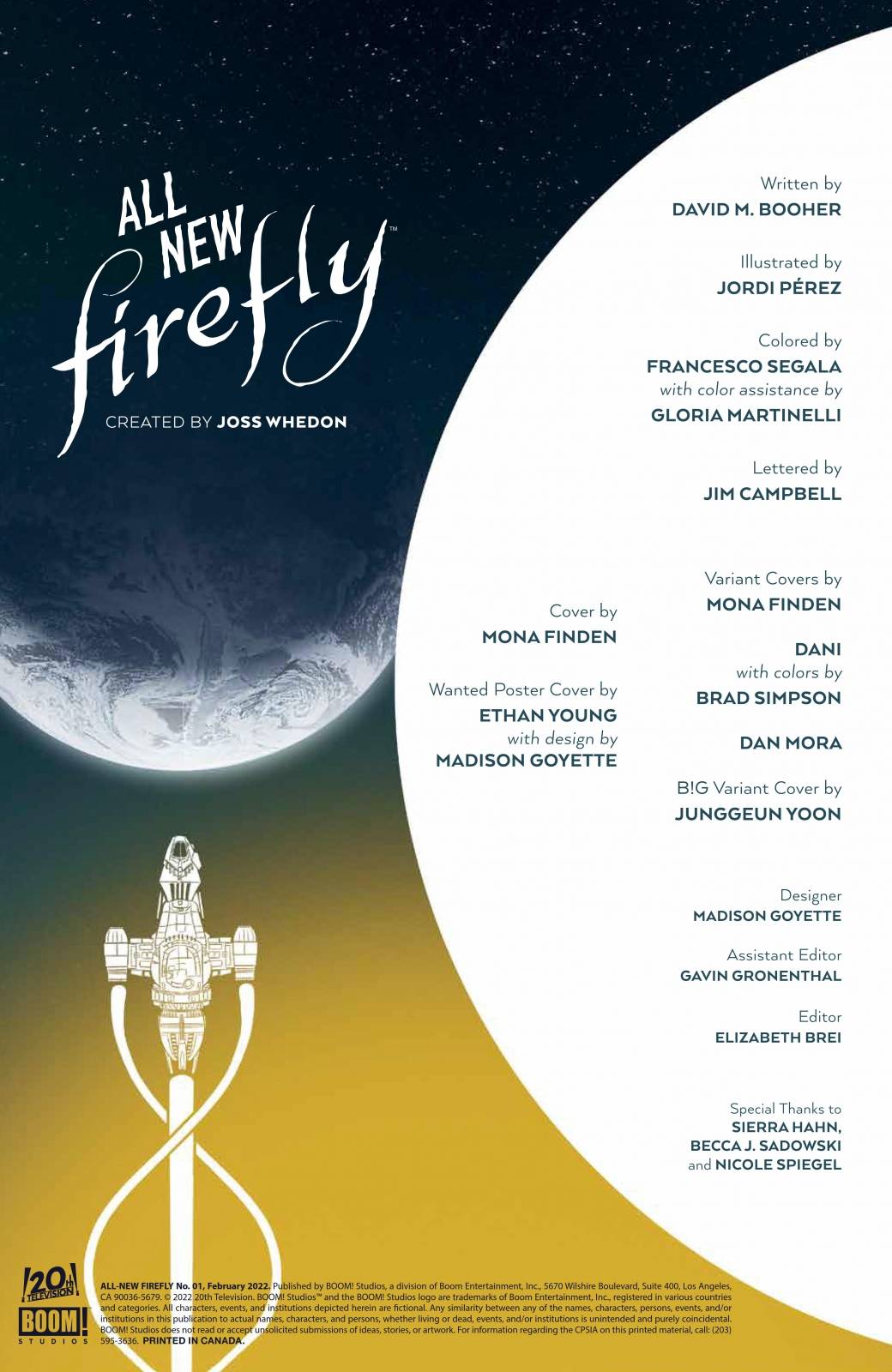Boom! Studios launches an All-New Firefly comic book series this coming Wednesday as the creative team of writer David M. Booher (Canto) and artist Jordi Pérez (Queen of Bad Dreams) take the helm of the Serenity. Check out the official preview of All-New Firefly #1 here…