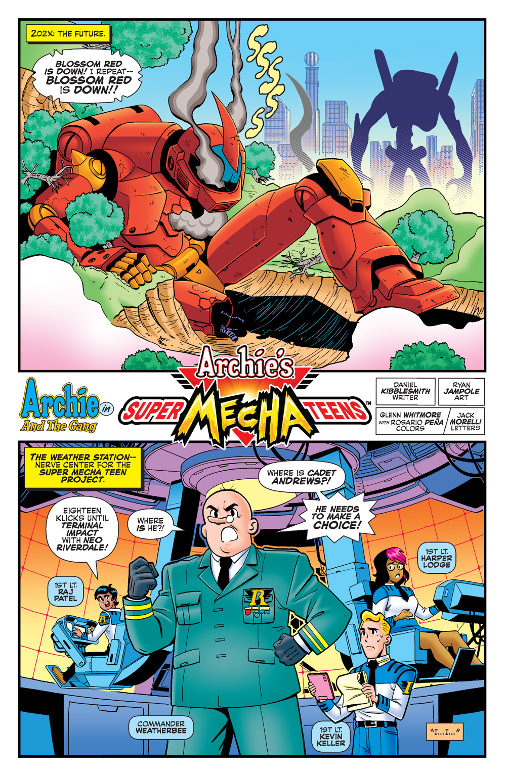A BRAND-NEW STORY kicks off this collection of tales of mecha monsters, heroic hijinks, and action-packed adventure! In “Super Mecha Teens,” a giant monster threatens to attack Riverdale, and only one teen (with some robot help) can save the day. Unfortunately, that teen is Archie Andrews. But he doesn’t have to do it alone! But who does he choose? Betty with her rugged, self-built mech, or Veronica with her hi-tech, hi-end robotics? As all the mechs are being mauled by the monster, Archie must decide in this story that’s equal parts Transformers and Pacific Rim.