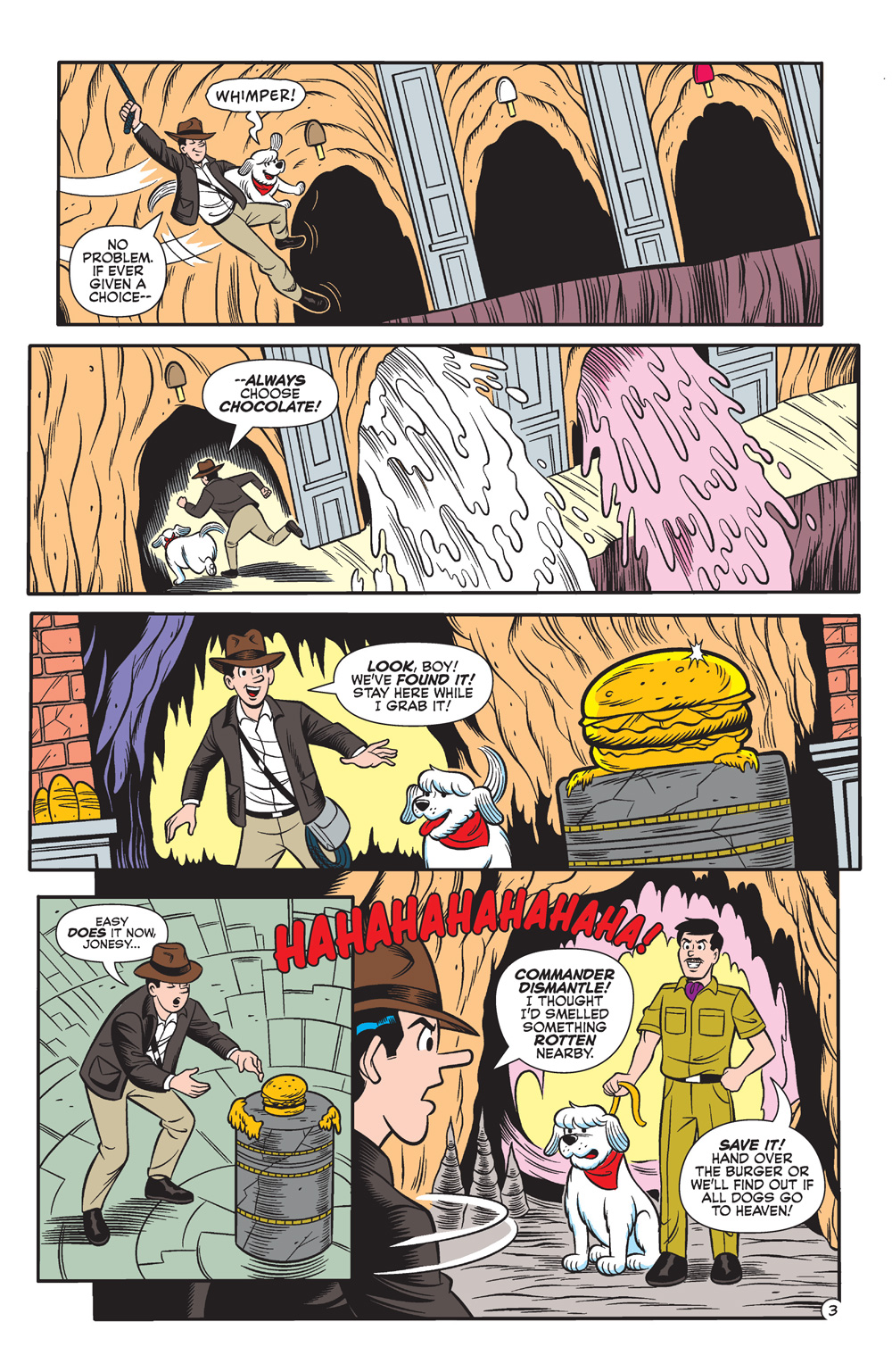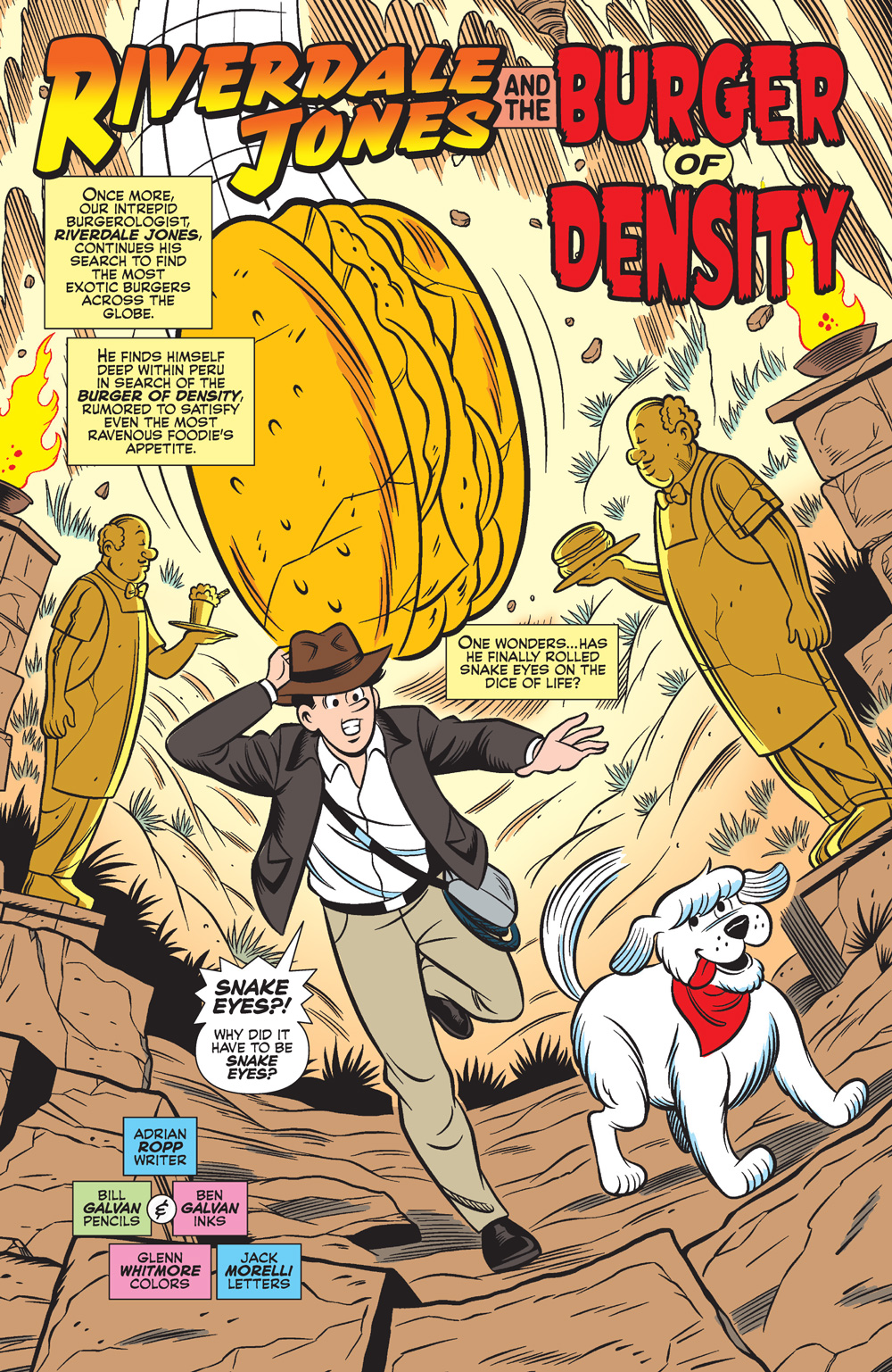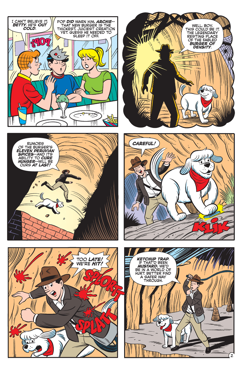A BRAND-NEW STORY kicks off this BLOCKBUSTER issue! In “Riverdale Jones and the Burger of Density,” Hero burgerologist (it’s a real job, trust us!) Riverdale Jones is deep in the heart of the rainforest to discover the most delicious, exotic burger recipe! Join our hungry hero Jughead, with his faithful pet Hot Dog by his side, in this fun, an adventure-filled riff on Indiana Jones just in time for the new movie!