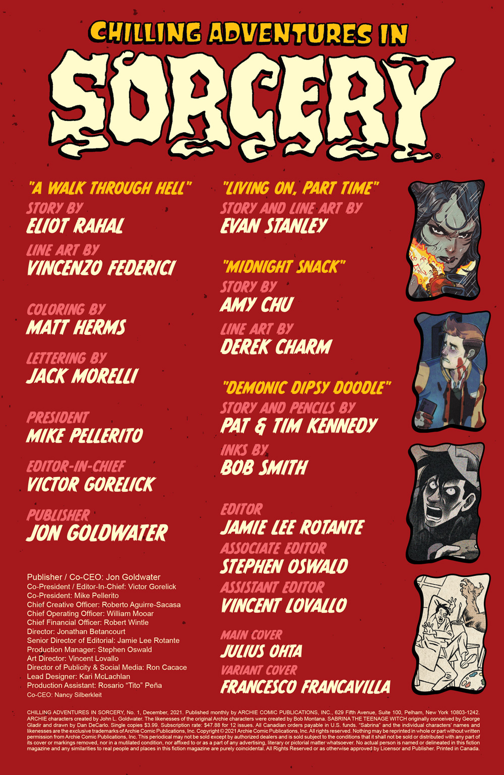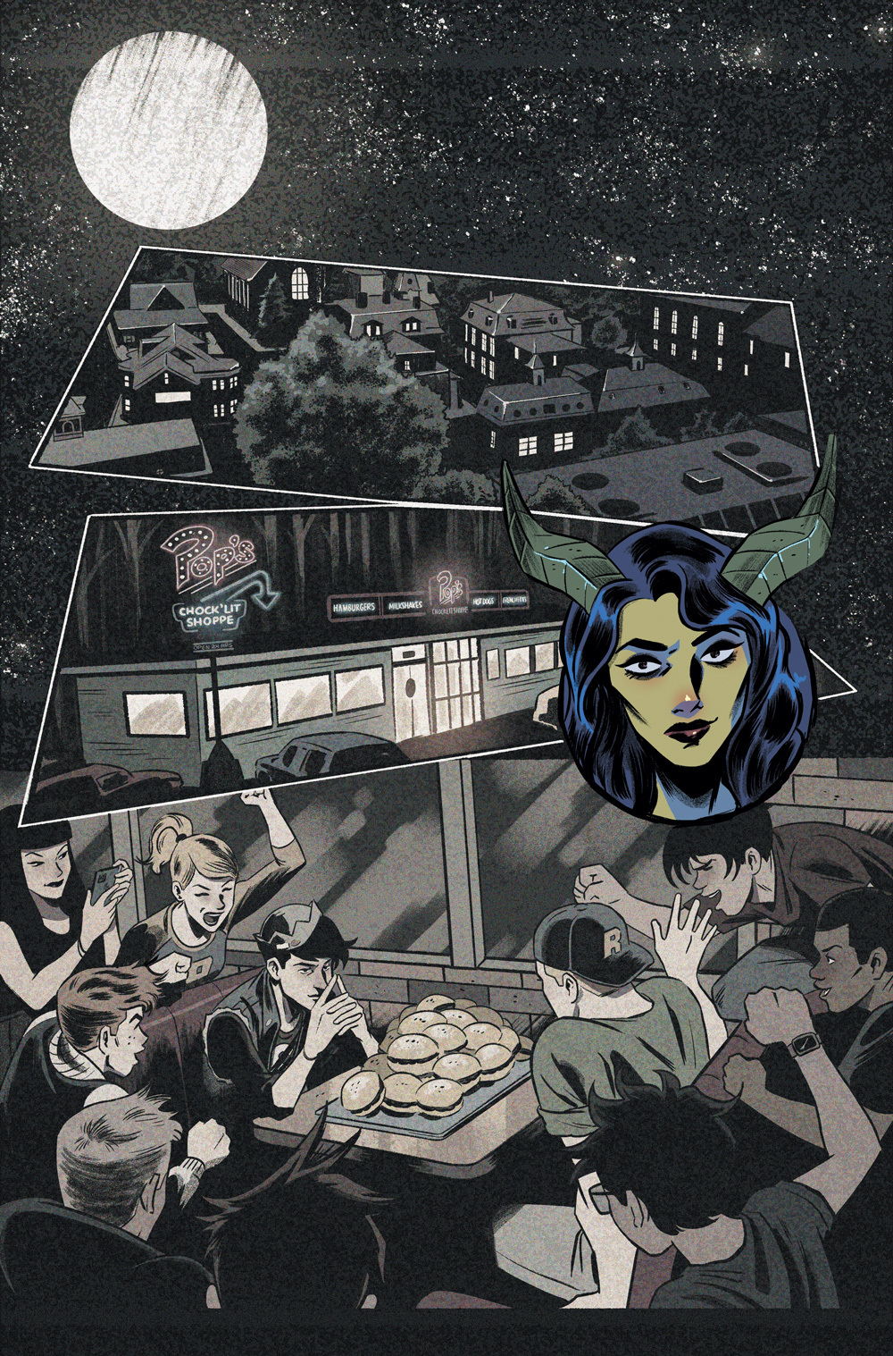 THE FUTURE OF ARCHIE COMICS STARTS HERE IN AN ALL-NEW ANTHOLOGY-STYLE ONE-SHOT! Madam Satan is our tour guide into this horrific world exploring the underbelly of Riverdale and its surrounding areas! Madam Satan is trying to escape Hell. She goes through the circles of Hell in reverse. Along the way she meets lost/tortured souls who tell their stories—like that of Archie Andrews, who accepted a seemingly normal job as the nighttime security shift at Riverdale’s local pizzeria and children’s mascot entertainment venue. Only to learn that the venue harbors a deep, dark, robotic, monstrous secret! And then there’s Jughead Jones, a teen who never met a food he didn’t like. Until now. What is that eerie noise coming from the kitchen…? All that plus more bonus frightful content sure to delight all Archie horror fans!