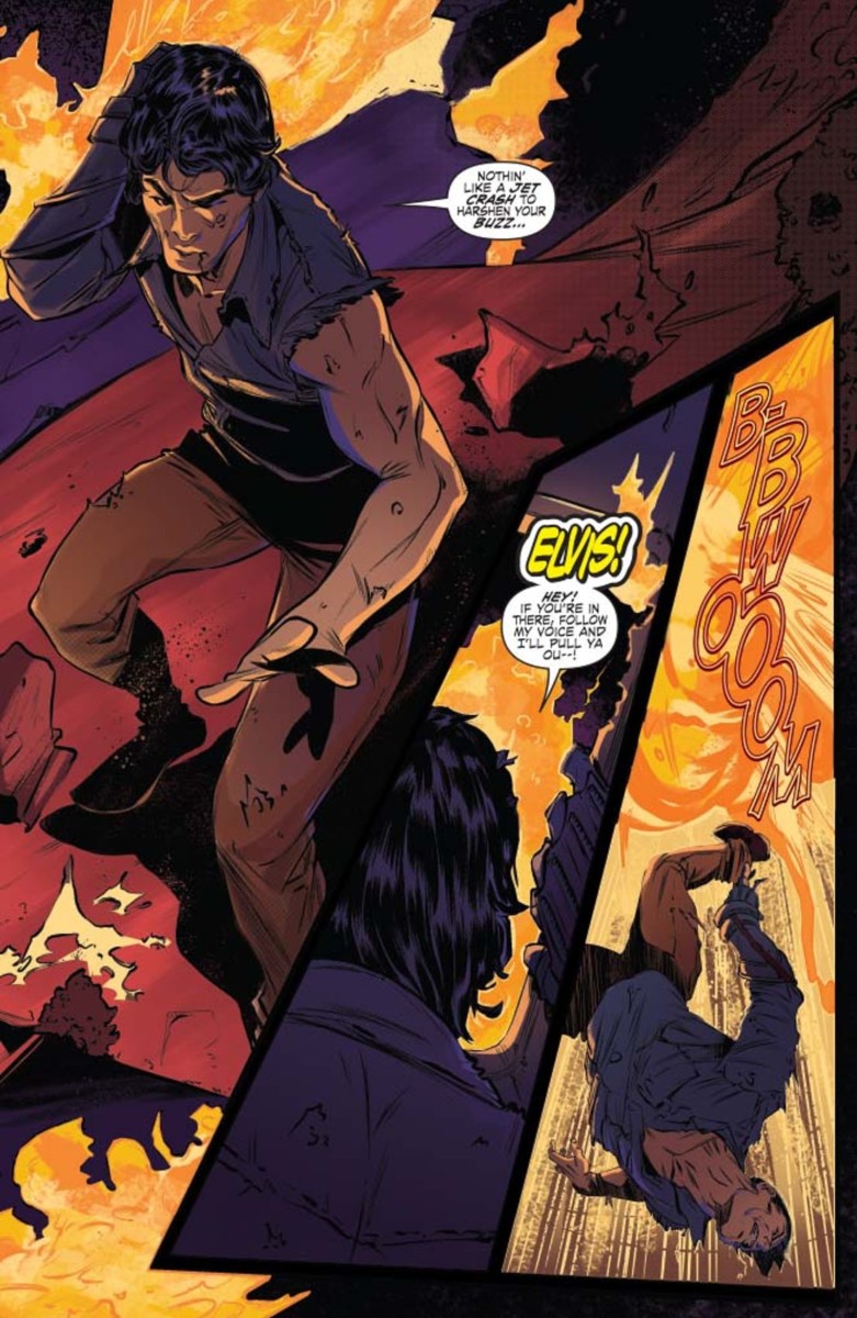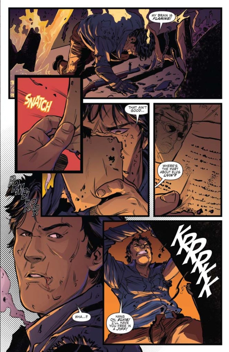 Following an unscheduled crash-landing in Graceland, Ash must quickly dust himself off and do what he does best—defending Necronomicons from Evil! As if plummeting into the King’s mansion wasn’t bad enough, Bubba enlists an undead Elvis impersonator to take on everyone’s favorite deadite-slayer while the fate of the real Elvis remains unknown. Don’t miss the deadly conclusion to this hunk of burning crossover grooviness that’s guaranteed to raise temperatures and set your soul afire!