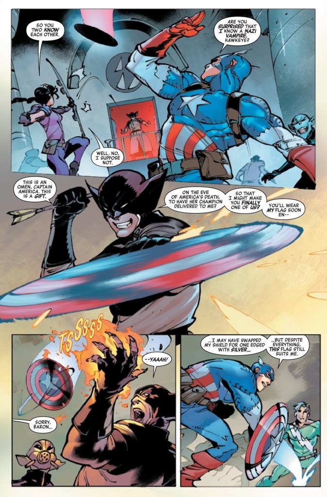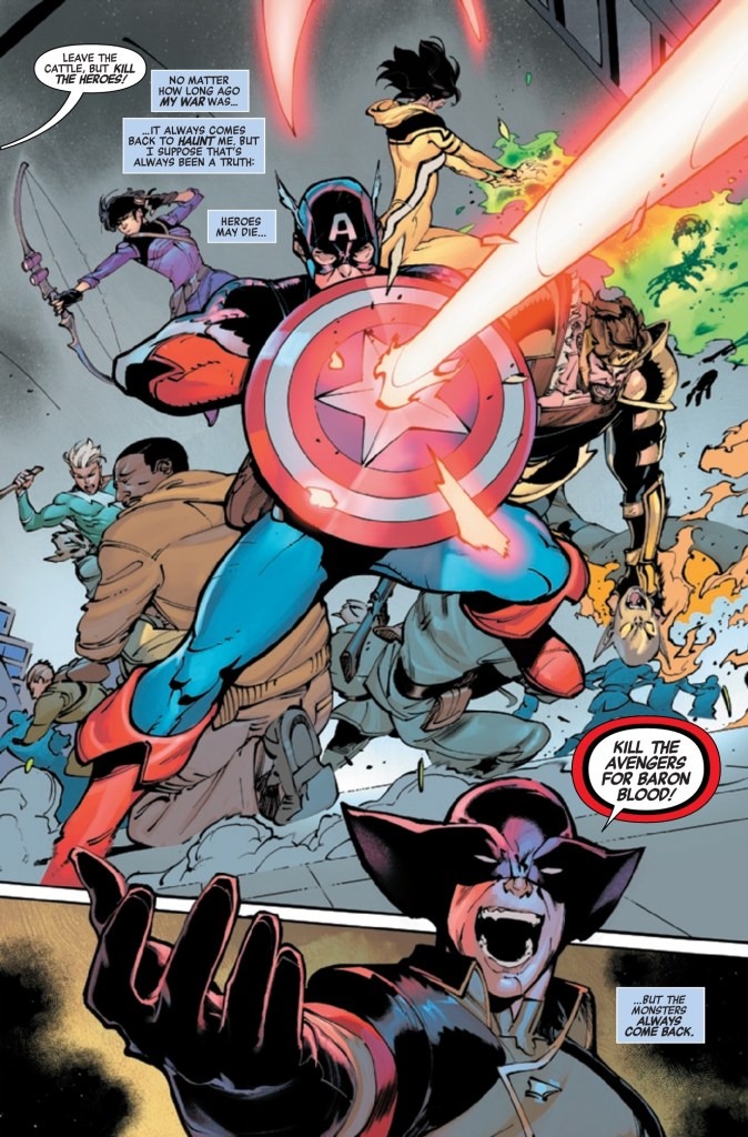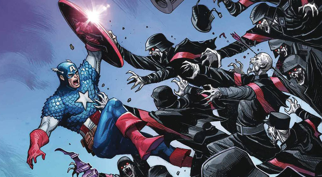 BLOOD HUNT TIE-IN: A BLOODY BRAWL ON A VAMPIRE-INFESTED HELICARRIER! Captain America’s ad hoc team of Avengers old and new must face a foe commanding an army of vampires…IN THE SKY! With a group of decidedly earthbound heroes! Don’t miss this action-packed, bloody tale of heroism and hemoglobin!