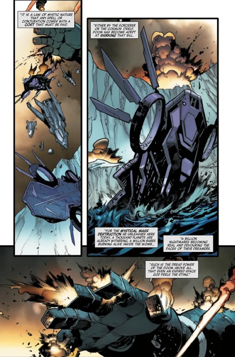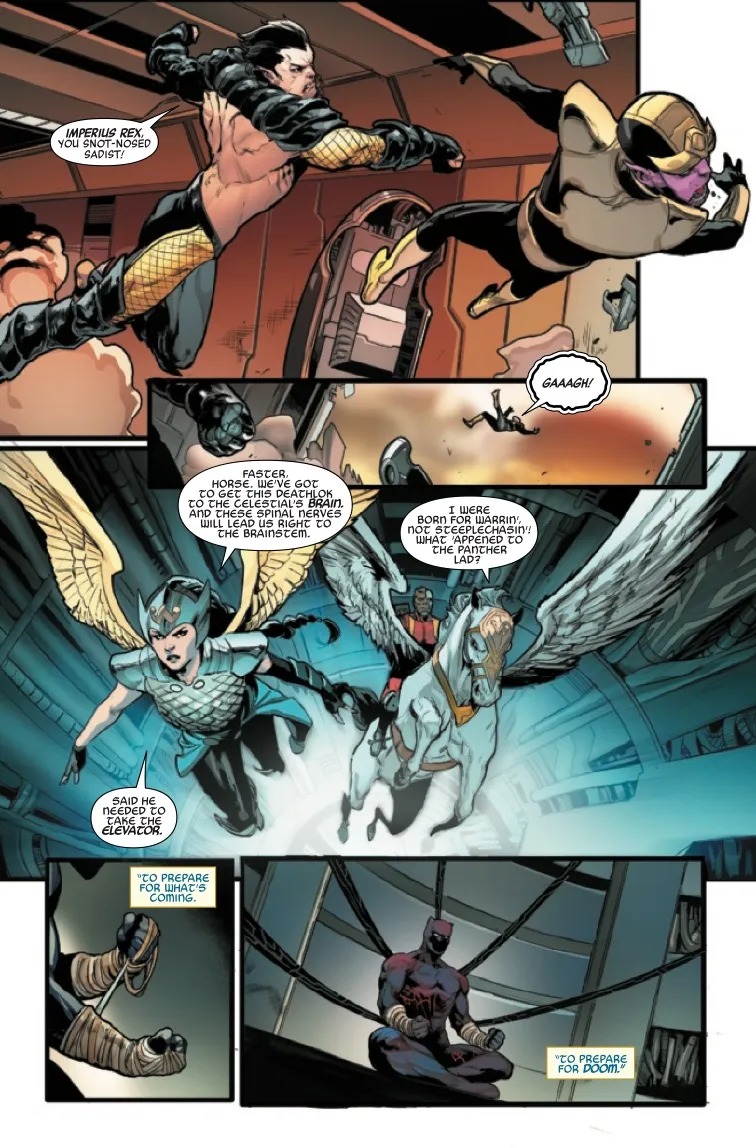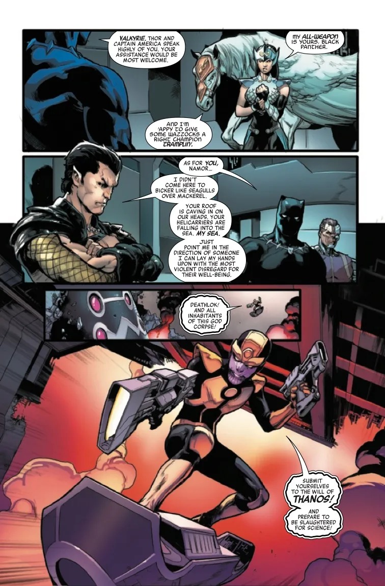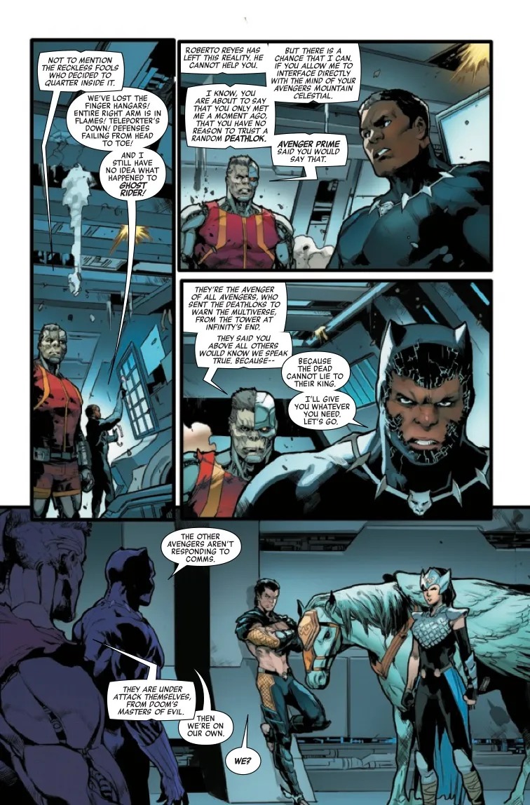 “ASSAULT ON AVENGERS MOUNTAIN! The Avengers’ impenetrable headquarters is under attack, by the most supremely powerful version of Dr. Doom in existence and a wildly murderous Young Thanos, still wet with his mother’s blood. The Black Panther fights to defend the mountain alongside his surprising new teammates, King Namor of Atlantis and Jane Foster, the mighty Valkyrie.”