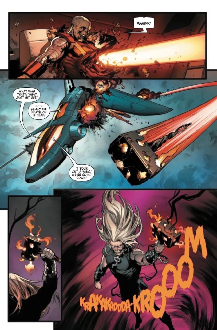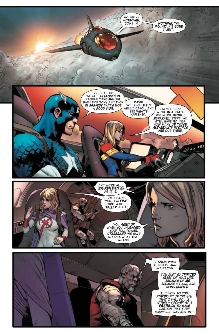 THE DEATH HUNT CONCLUDES! Doom Supreme and his Multiversal Masters of Evil have come hunting Deathloks. And now there’s only one Deathlok left, trapped inside the rubble of a besieged Avengers Mountain. Just in time for a new group of Avengers to rise from the ruins, with new members and at least one Avenger having been wildly transformed. And just who is the cosmic general who commands the Deathloks, the mysterious Avenger Prime?
