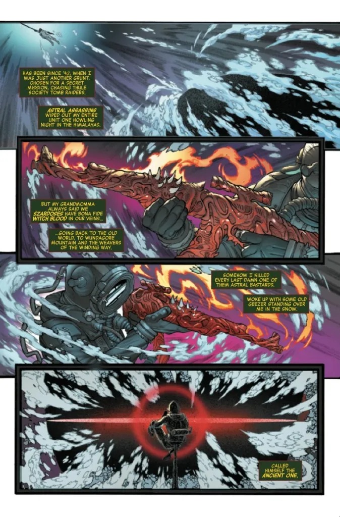 MEET HISTORY’S MIGHTIEST HEROES! The Avengers are lost in time, and if they’re going to stop Mephisto’s grand plan, they’ll need help from some of history’s greatest heroes, whose stories have never been told. Like the mystical man of war, Sgt. Szardos, Soldier Supreme of World War II, and his squadron of supernatural grunts, the Secret Invaders.
