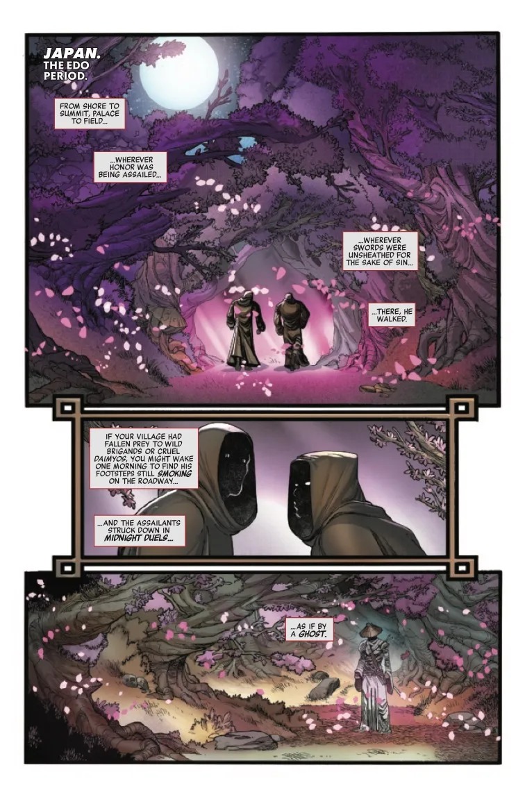 Japan, the Edo Period. They say he walks by night, wielding a blade forged by hellfire. And where he wanders, the penance flows, like fountains of blood. He is the fabled Ghost Ronin, the Samurai of Vengeance. And alongside the Avengers, he will make his final stand against the lightning swords of the devil himself.