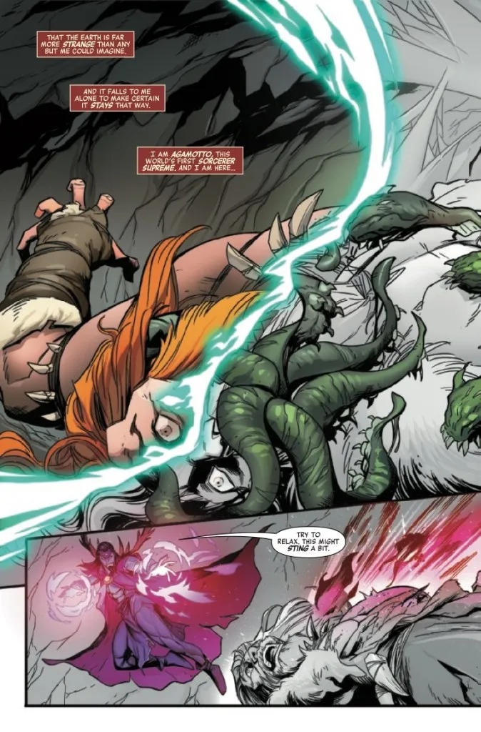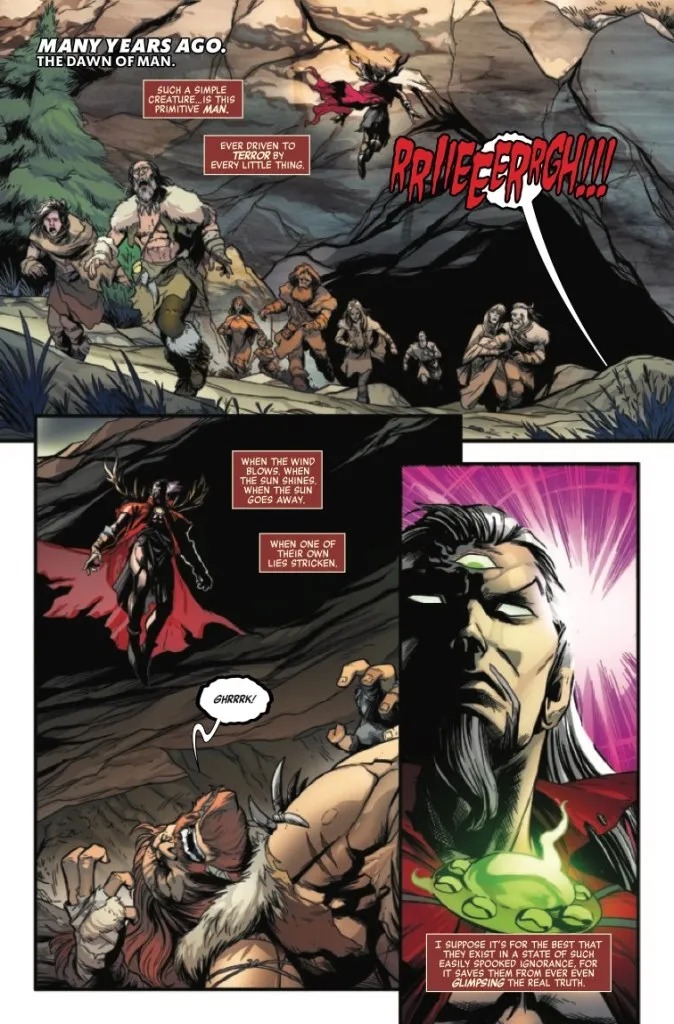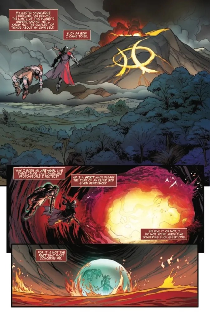 History’s Mightiest Heroes: Conclusion! The Avengers’ epic quest through the darkest and weirdest corners of time comes to an end with an issue that focuses on the prehistoric forefather of all things dark and weird in Marvel history: Earth’s very first Sorcerer Supreme. Prepare to see all of history through the eyes of Agamotto.