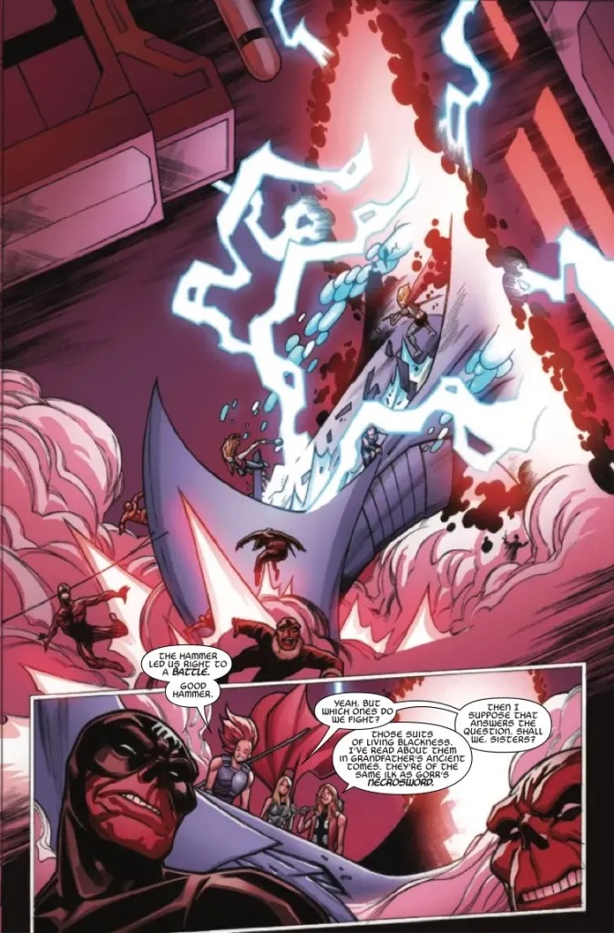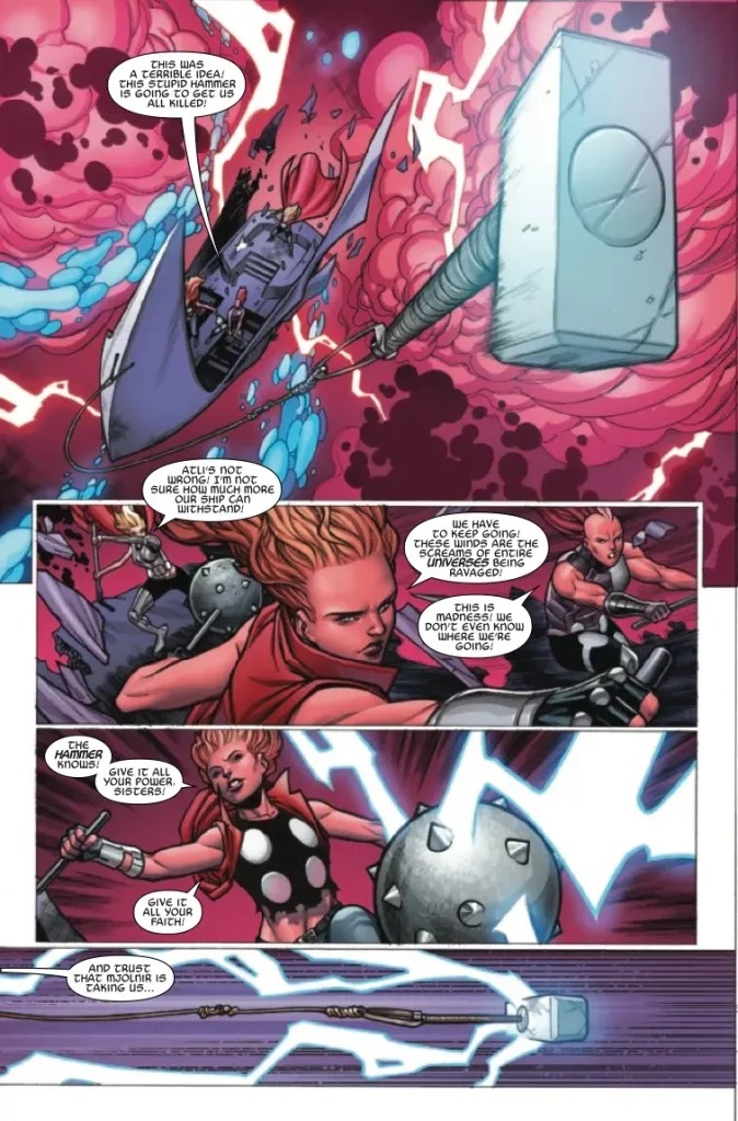 “THE RETURN OF THE GODDESSES OF THUNDER! Atli, Ellisiv and Frigg are the granddaughters of Old King Thor, last seen during the end of Jason Aaron’s landmark THOR run. Now the Goddesses of Thunder are back, sailing the wild cosmic seas, chasing the thunder that echoes across universes…and hunting for fallen hammers.”