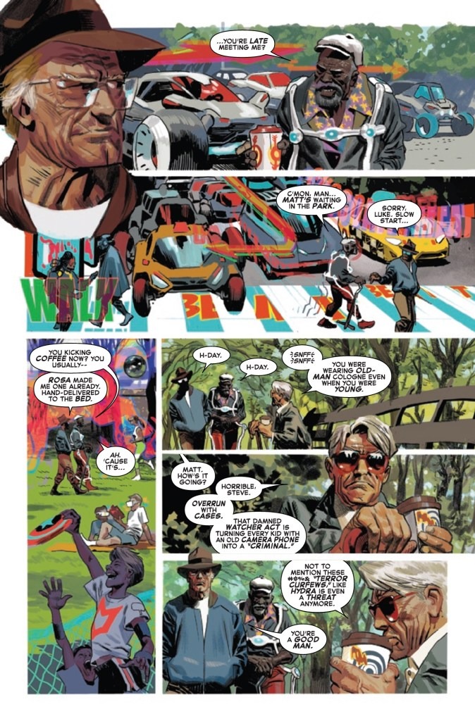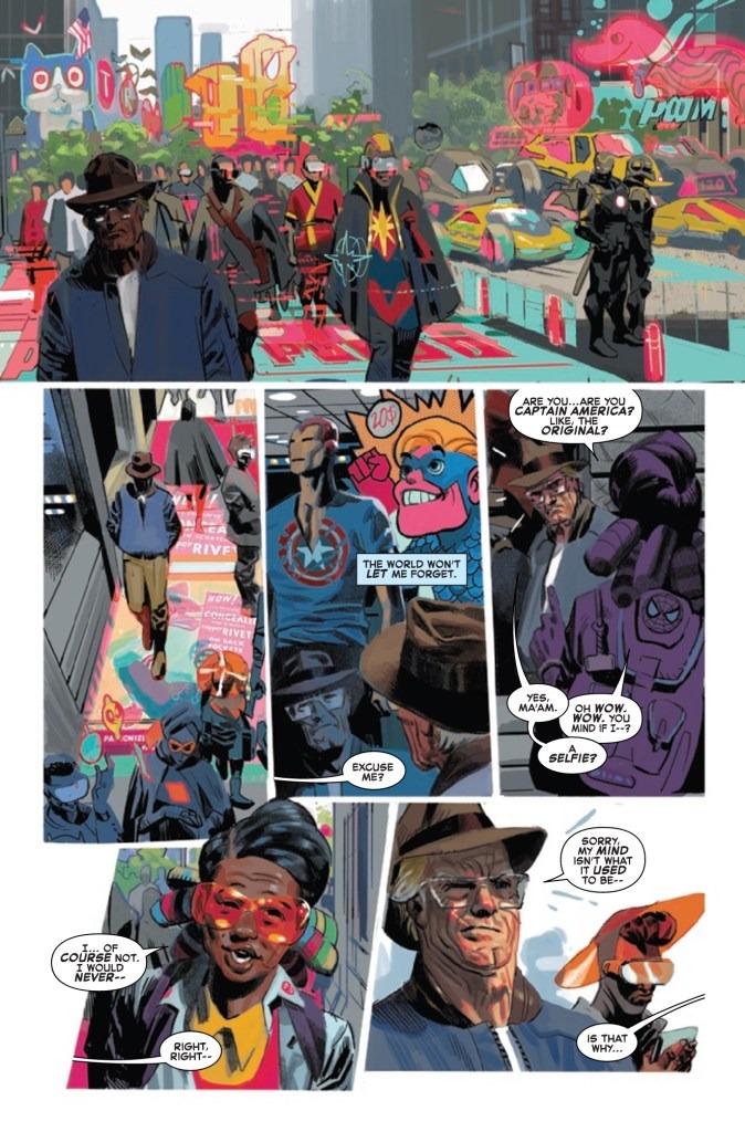 In a gleaming new world of prosperity, Captain America is no more. But Steve Rogers still exists, floating through an America where freedom is an illusion, where THE AVENGERS are strangers and his friends are long dead. But is the Dream? How do you assemble Avengers in a world that doesn’t want them? PLUS: A behind-the-scenes look at the making of this issue!
