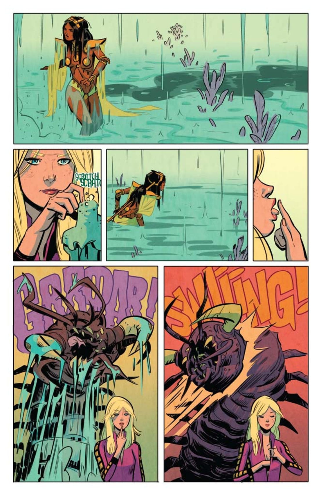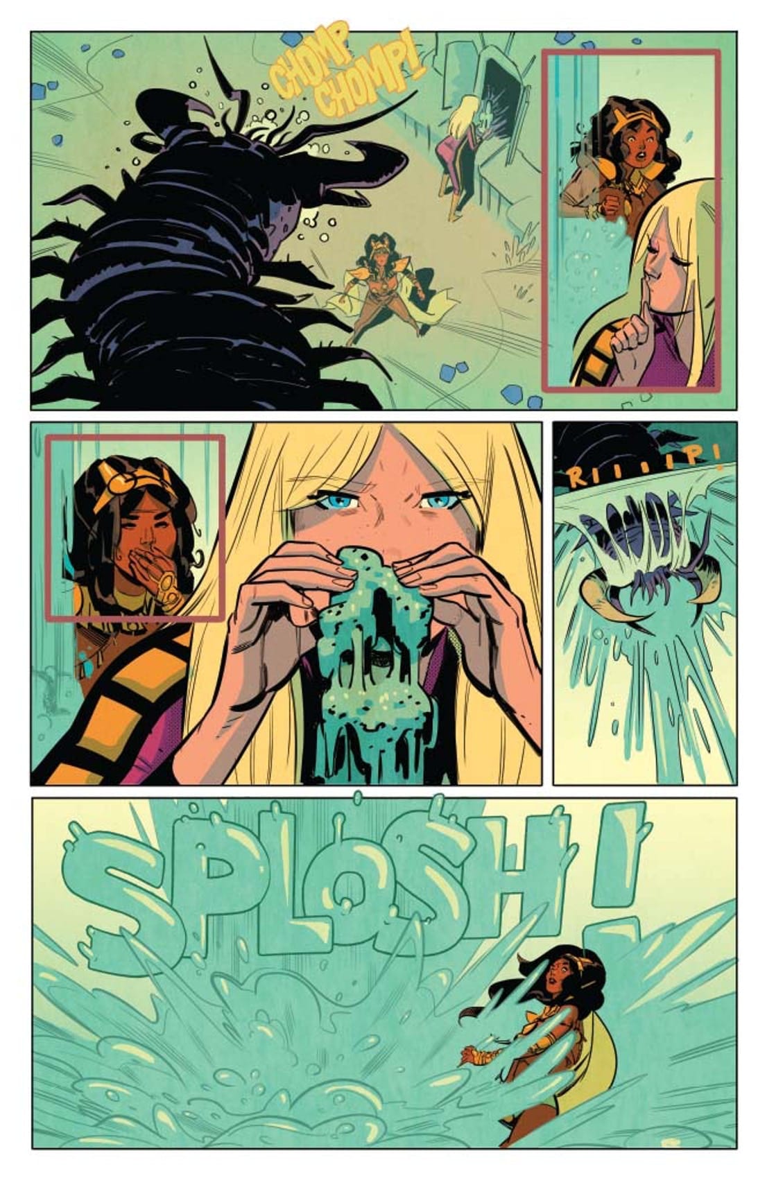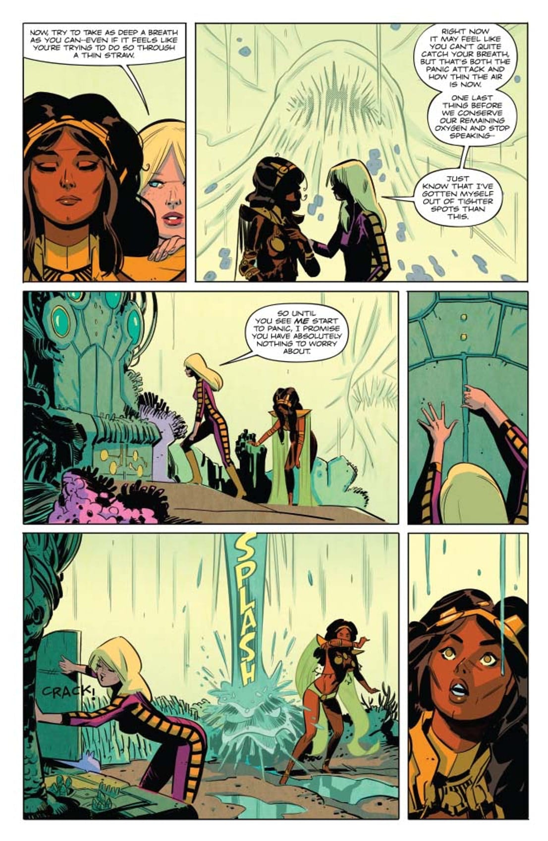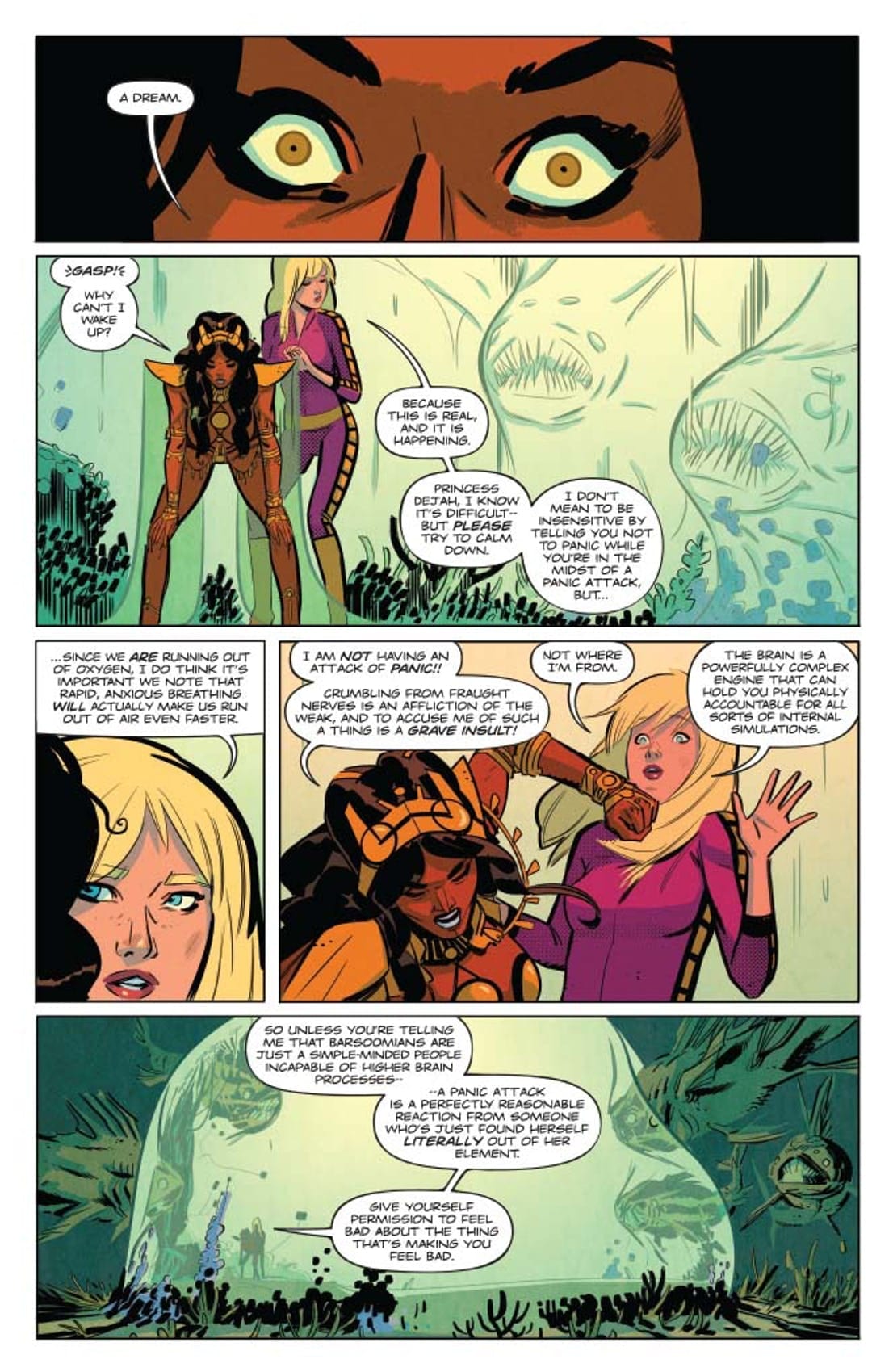 The Femmes from the Future find themselves on a world entirely covered by oceans. That’s no big deal, what with Earth 70% covered, but for the desert-born Dejah of Mars, some water wings are needed, stat! Really, though, the endless depths are the easy part… it’s the creatures lurking in the unknown that are the real threat, especially the intelligent ones!