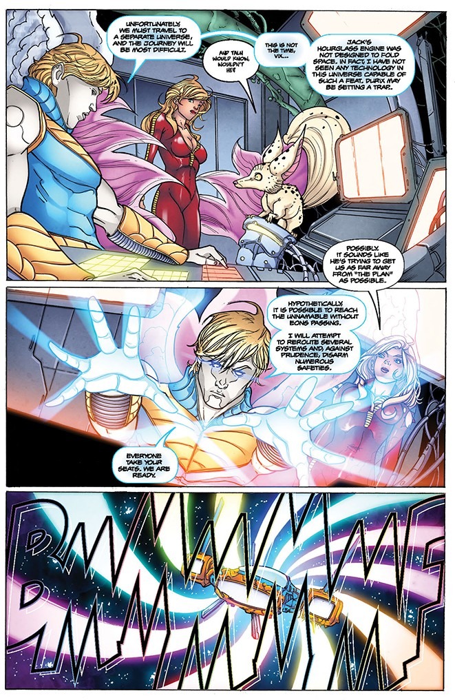 Prepare to enter the ultimate unknown! Barbarella, Vix, and Taln know where to go to discover the galactic secrets of the Unnamable. Unfortunately, that means travelling beyond the edge of our galaxy and into the next — assuming they survive the termination shock on the way through! It’s a massive risk, but the chance to avert a galactic war that would kill trillions makes the lives of two females and a male hologram seem small by comparison — though maybe not to them!