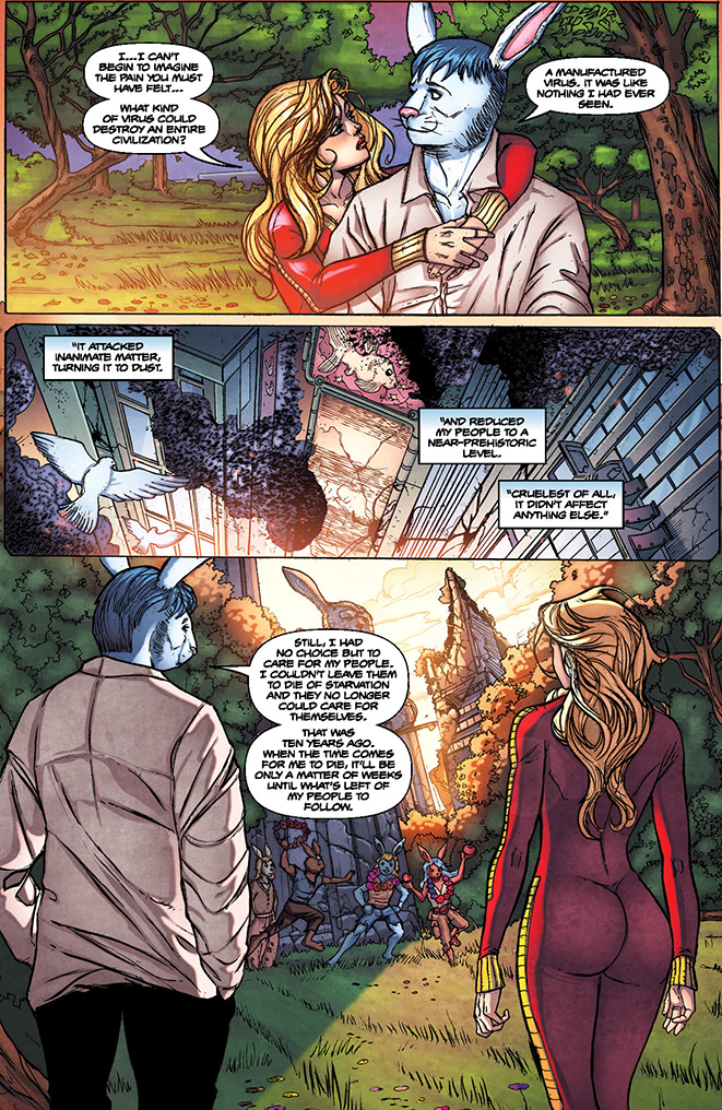 Out of the fire and into… what, exactly? Barbarella has managed to escape the home world of the Architects, but now she finds herself on a once-thriving world long ago reclaimed by nature and a people forever reduced to helpless foragers. But there’s something else hidden on this world as well, an armed resistance, brought together to avenge the countless victims of the Architects. Meanwhile, Vix–left behind on the home world–now finds herself on the receiving end of some very dangerous questions. Prepare yourself for an exclusive look inside the brain of Vix, or at least the brain of Vix on drugs!
