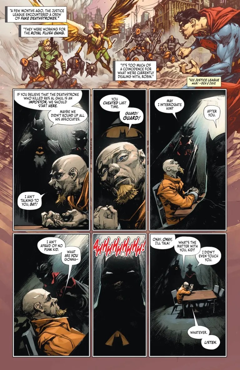 SHADOW WAR, PART 5 – Batman and Robin are finally reunited! Together they will hunt for the truth behind the death of Ra’s al Ghul! But then who is left to defend the Secret Society against the League of Shadows? Deathstroke’s fight against the Demon’s Shadow ends with a shocking cliffhanger! Plus, what happens when you get Deathstroke infected with Joker toxin? Find out in the epic backup story!
