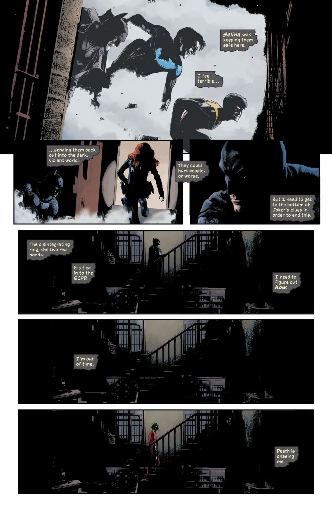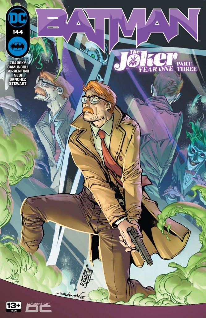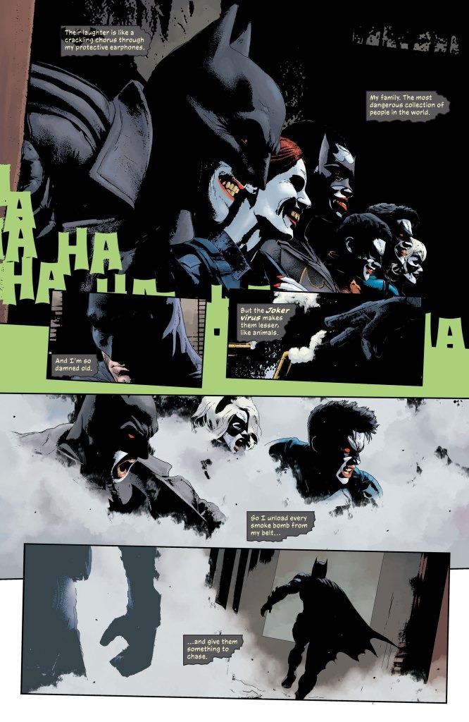 The climactic, chilling conclusion to “The Joker Year One” that will have massive repercussions for the future! The Red Hood Gang is on a rampage and the only man who can stop them…is The Joker! And can Batman stop a devastating new virus in a future where The Joker looms over him?