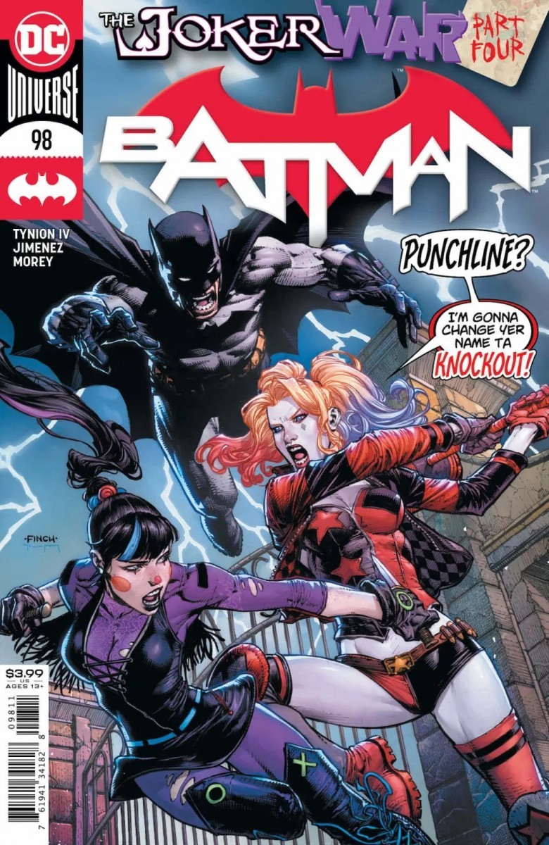 “The Joker War” part four of six! Batman is at his most vulnerable following a massive dose of an experimental new Joker toxin. With the Dark Knight haunted by demons and visions, it’s up to Harley Quinn to protect him while he recovers-because Punchline is on her way!