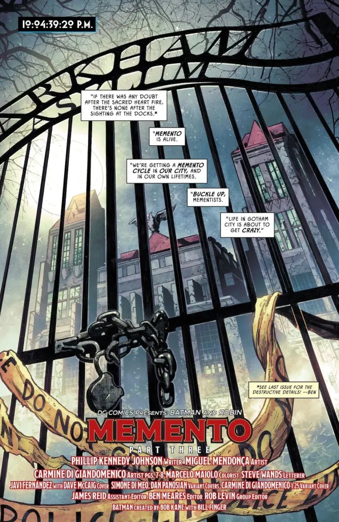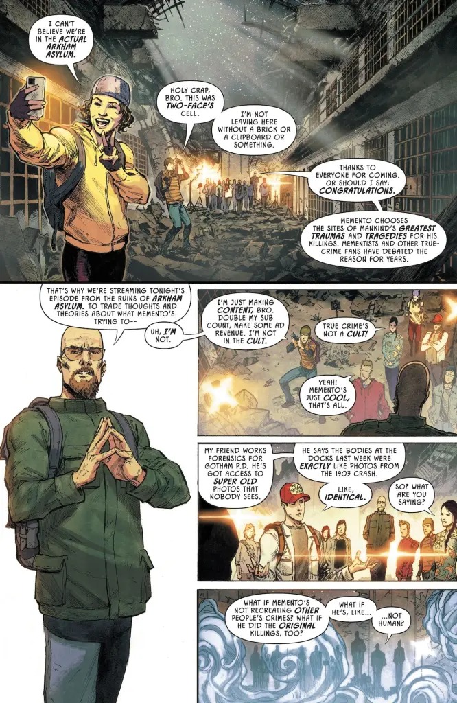 As the Dynamic Duo attempts to solve the mysteries of Memento’s recent attacks, Batman begins to fear that his bond with his son and partner is beginning to fracture. Is this simply teenage angst, or is Damian truly pulling away from his father? Meanwhile, Memento emerges from the shadows, and the stone-faced specter of atrocities past makes himself known in the Gotham underworld.