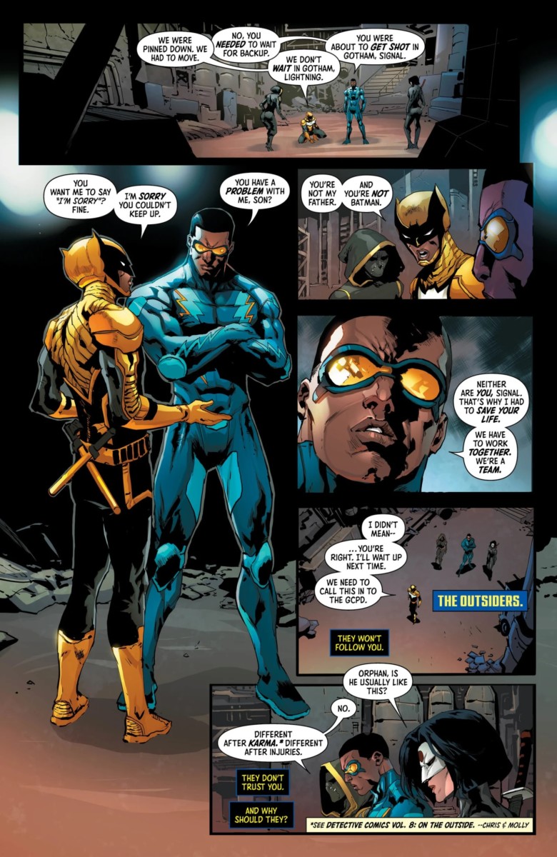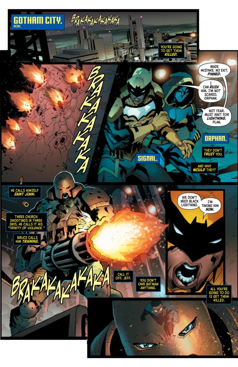 When the quest for justice drives Batman into some morally ambiguous areas, he calls in the most moral man he knows: Jefferson Pierce, a.k.a. Black Lightning, and his team of operatives known as the Outsiders!
