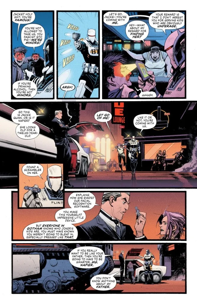 The hunt continues as Bruce Wayne searches for the most dangerous offspring in Neo-Gotham, the daughter of The Joker! Little does he know the new Batman is right behind him, waiting for just the right moment to strike and put an end to the older generation of heroes in the city. All seems to be going according to plan for Derek Powers, as his true intentions are revealed. Plus, Ace the Bat-Hound joins the story!