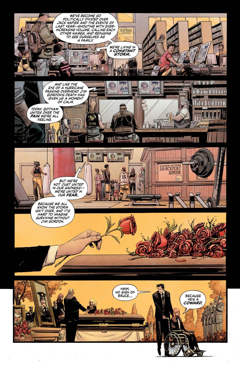 The GTO struggles to forgive Batman for his behavior on the tails of tragedy, but a promising path forward comes into focus when he uncovers a monumental clue about the mystery of Gotham’s ancestral curse. It may prove too little too late, as Azrael breaks free of Ruth’s mandate and unleashes a radical new reign of terror over the city and its competing super-criminals.