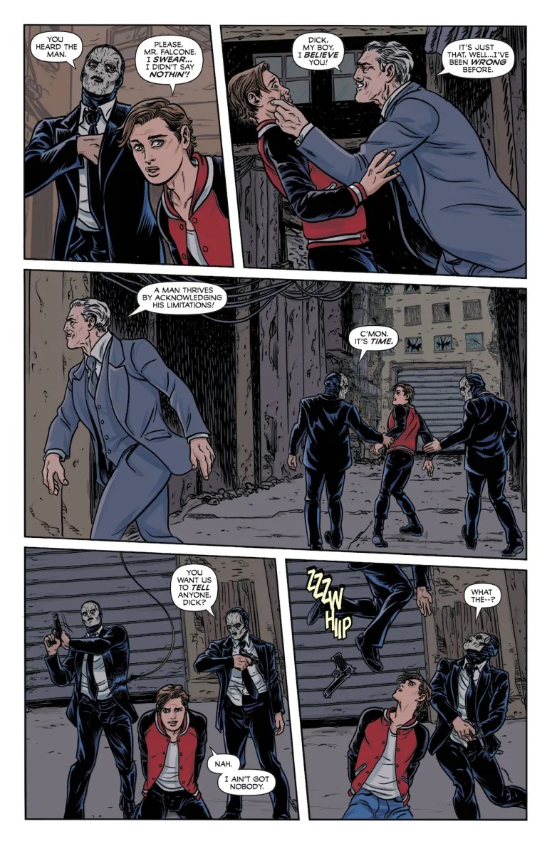 MARK RUSSELL AND MIKE ALLRED TAKE ON THE DARK KNIGHT LIKE ONLY THEY CAN! Batman’s world begins to grow as the people of Gotham realize they only need a costume to justify their problematic behavior. Fortunately, with Robin at his side and an empowered populace, Batman begins to turn the tide in his war against crime. But he isn’t the only one preparing an army — Falcone is readying his own recruits to take the battle to new lows. Will a figure from Bruce’s past play a key role in the battle to come?