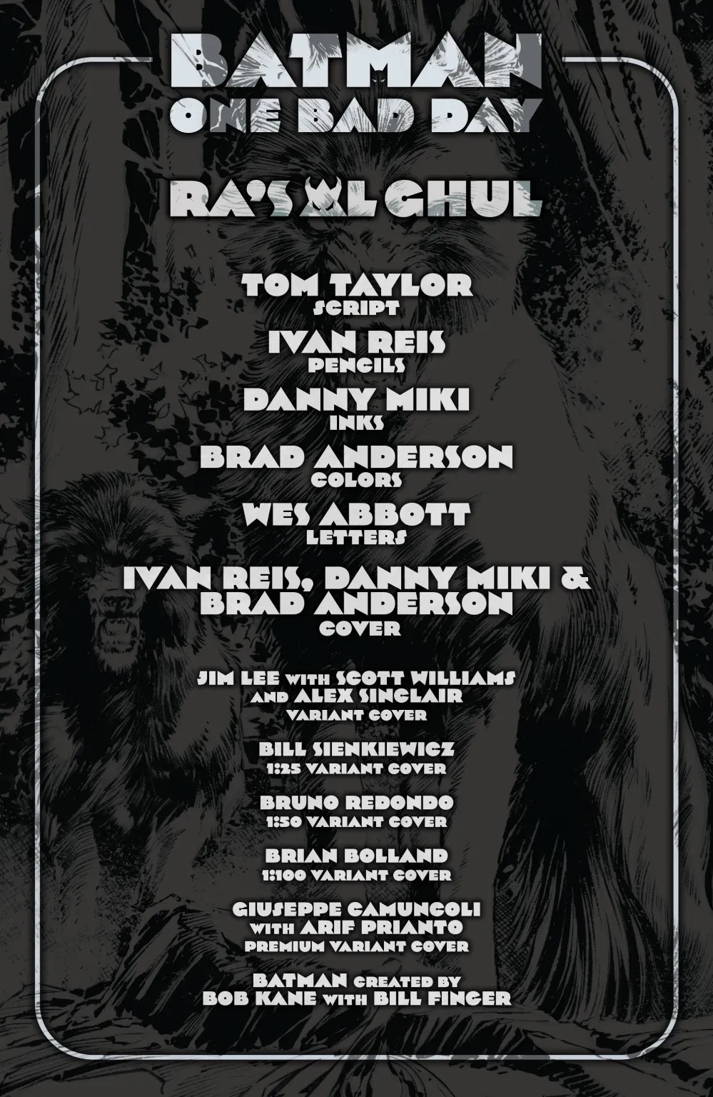 WHY WON’T BATMAN SAVE THE WORLD?! For centuries Ra’s al Ghul has wanted to save the Earth from the worst of humankind, and for centuries he has failed. Recently his greatest obstacle has been the Dark Knight Detective, Batman. Ra’s offered Batman a chance to be a part of his new world order, but Batman refused. For years their cold war has raged, but Ra’s will have no more. Ra’s will remove Batman from the equation and save the world, re-creating it in his image and bringing the peace and prosperity all the good-hearted souls of this Earth deserve. Don’t miss this epic tragedy from the all-star creative team of Tom Taylor (Nightwing, Superman: Son of Kal-El, DCeased) and Ivan Reis (Detective Comics, Blackest Night): the last of the One Bad Day specials, and one of the most epic to date.