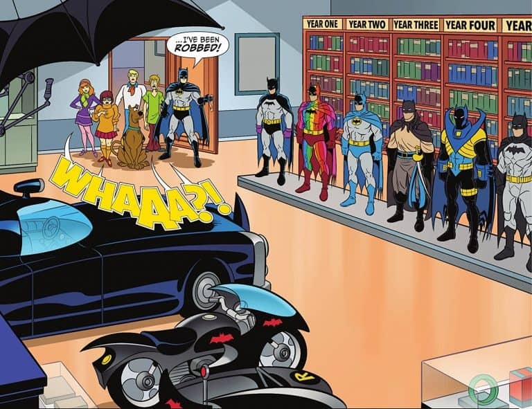 “It’s an all-new, all-ages series that teams the Dark Knight with Scooby-Doo and the sleuths of Mystery Inc.! When Batman discovers his original purple gloves have gone missing, Velma, Shaggy, and Scooby-Doo travel back in time to Batman’s Year One era to solve the case! Will this “Glove Story” have a happy ending?”