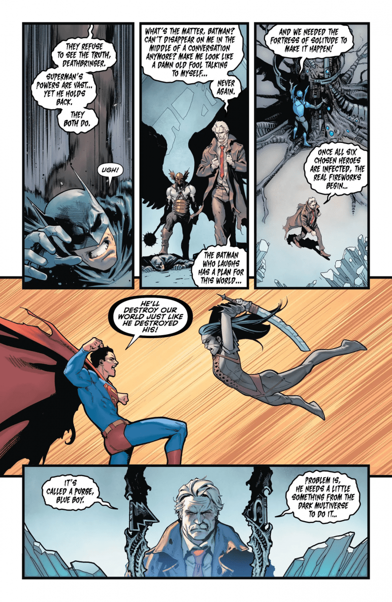 Even from prison, the Batman Who Laughs is staying two steps ahead of the Caped Crusader and the Man of Steel. His plan to infect heroes and turn them into the Dark Multiverse versions of themselves is starting to build steam, with Shazam and others already succumbing to his evil toxin. Batman and Superman are racing the clock to prevent the other three members of the Secret Six from being poisoned, but they realize they are too late when those three come looking for them instead-one of whom is a lot closer to Superman than expected and itching for a fight!