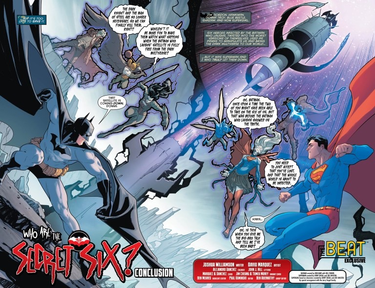 The Batman Who Laughs has unleashed his Secret Six! Now these infected heroes threaten to spread their dark infection across our world, and the only thing that might stop them is the combined might of the Dark Knight and the Man of Steel. If they fail, the planet will become the seed that grows a new Dark Multiverse-heroes will fall, villains will rise, and a new era dawns for the DCU in this explosive first arc finale that leads directly into Year of the Villain: Hell Arisen #1!