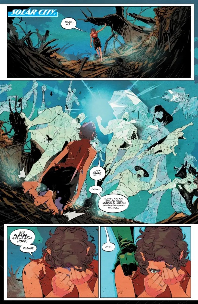 Eclipso’s reign of terror has brought the Justice League to the brink of civil war… but there must be a way to break the spell! The answer lies within the very power source that allows Superman to race faster than a speeding bullet… It’s a battle for Earth’s yellow sun in the dramatic conclusion of “Darkness Falls”!