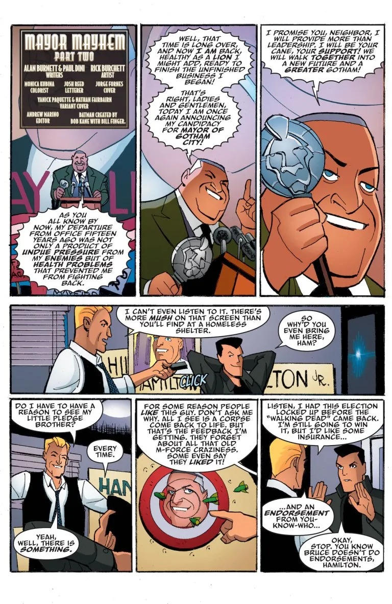 Former Mayor Mayfield’s influence over Gotham grows as the campaign picks up speed. As Batman and his team investigate where Mayfield has been, Batgirl decides to infiltrate the campaign herself. How is Mayfield charming his way around Gotham, and why are clues pointing to Arkham Asylum?