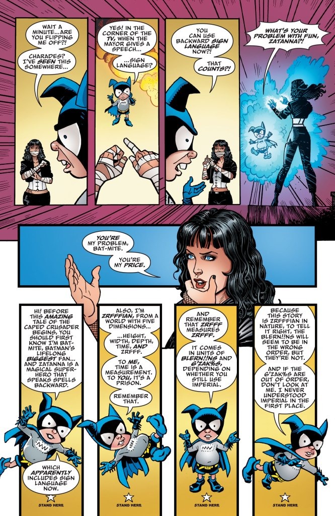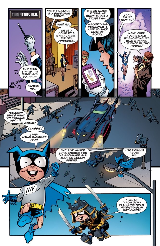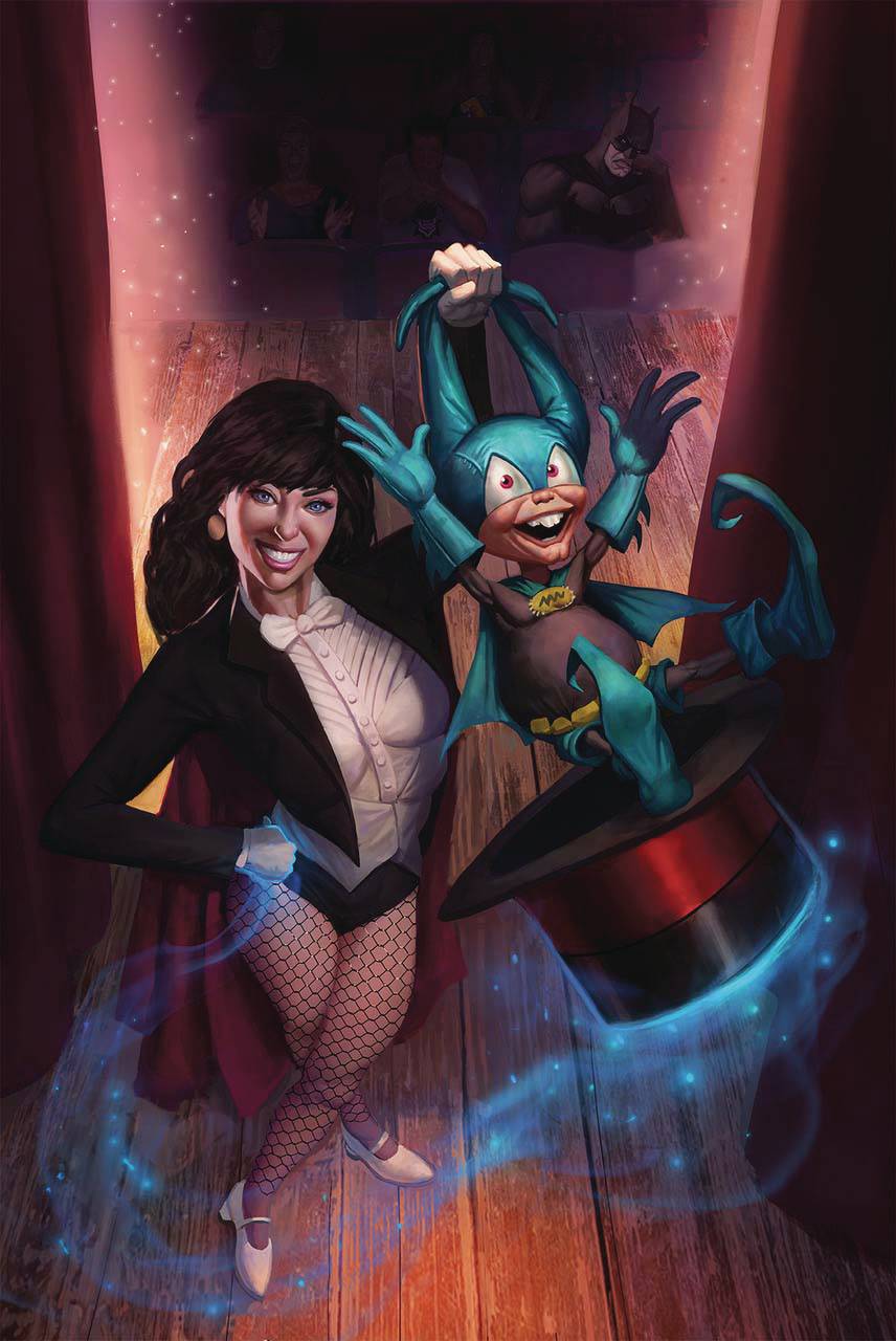 Zatanna and Bat-Mite’s unexpected history is revealed in a time-hopping feature story from Ty Templeton! Plastic Man and Wonder Woman have infiltrated the Mirror House in search of the stolen Lasso of Truth, but will they ever make their way out? Animal Man’s unexpected team-up reaches its stunning conclusion! Batman awakens to find himself with a tattoo…but why is it spreading? Find out in this thrilling final issue!