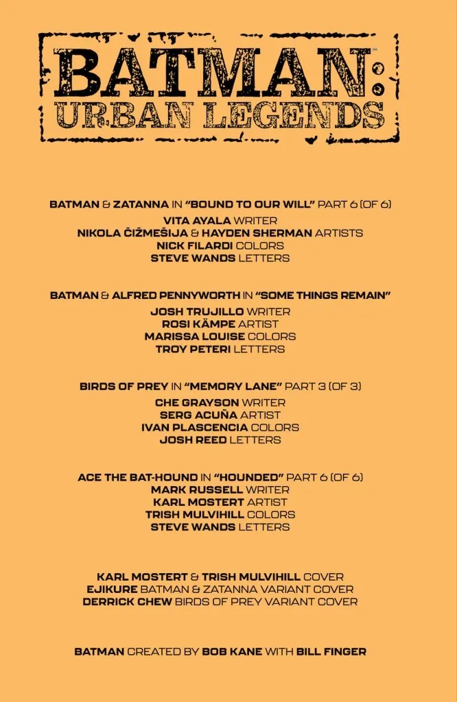 Batman and Zatanna stand up against the curse they’ve been facing throughout their whole relationship! Ace and his Super-Pet compatriots make their last stand. Will the new Birds of Prey crumble because of their lack of trust in each other? And we go back in time for a Batman and Alfred team-up story where Alfred’s taking the lead on the action!