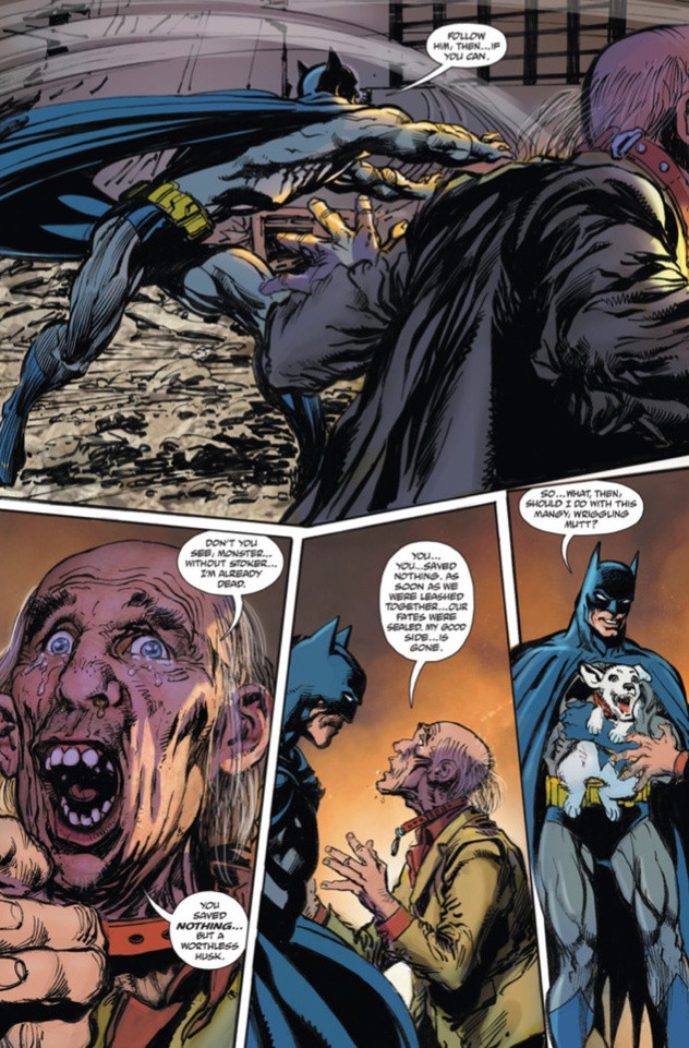 Gotham City is under siege by terrorists, and Batman is determined to find the source. But when Boston Brand tries to intervene, he discovers an even more disturbing and deadly truth: the terrorists are led by an inhuman monster. Ra’s al Ghul has volunteered his own private security force to aid the GCPD, and now they are the only thing standing between nuclear terror and the townspeople! But al Ghul’s true goal is hidden from everyone’s eyes. He will destroy the city and kill Batman-this time for good. Watching in horror is… Bruce Wayne?