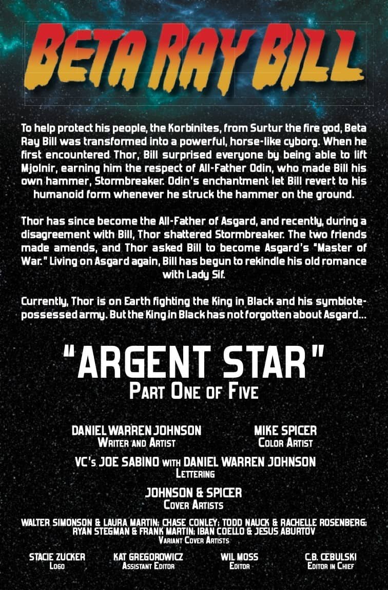 FROM THE PAGES OF DONNY CATES’ THOR AND SPINNING OUT OF THE EVENTS OF KING IN BLACK! The second-most famous wielder of Mjolnir. The right-hand man to the god of Thunder. And now, a warrior without his best weapon. Beta Ray Bill is tired of playing second fiddle to Thor – and with Bill’s famous hammer, Stormbreaker, recently destroyed at the new All-Father’s hands, tensions are higher than ever. The Korbinite must strike out in search of a new weapon…and a new destiny. Assuming he can first defeat a Knullified Fin Fang Foom! Writer/artist Daniel Warren Johnson (Extremity, Murder Falcon) and colorist Mike Spicer take Beta Ray Bill on a journey beyond the shadow of a god! Plus: This oversize first issue contains an exclusive conversation between Johnson and Beta Ray Bill’s creator, the legendary Walter Simonson!