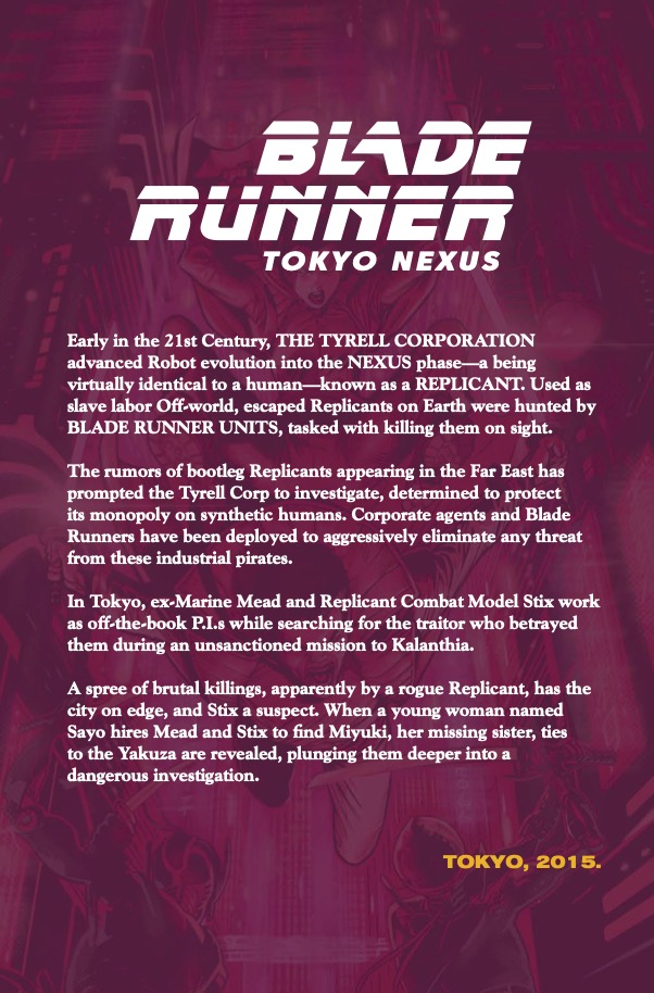 Now operating as an unofficial private detective agency, Stix and Mead find themselves caught up in a deadly Patent War between the Yakuza, the Tyrell Corporation and Cheshire, a rival corporation developing their own bootleg Replicant technology as they search for a missing woman.