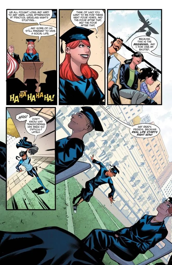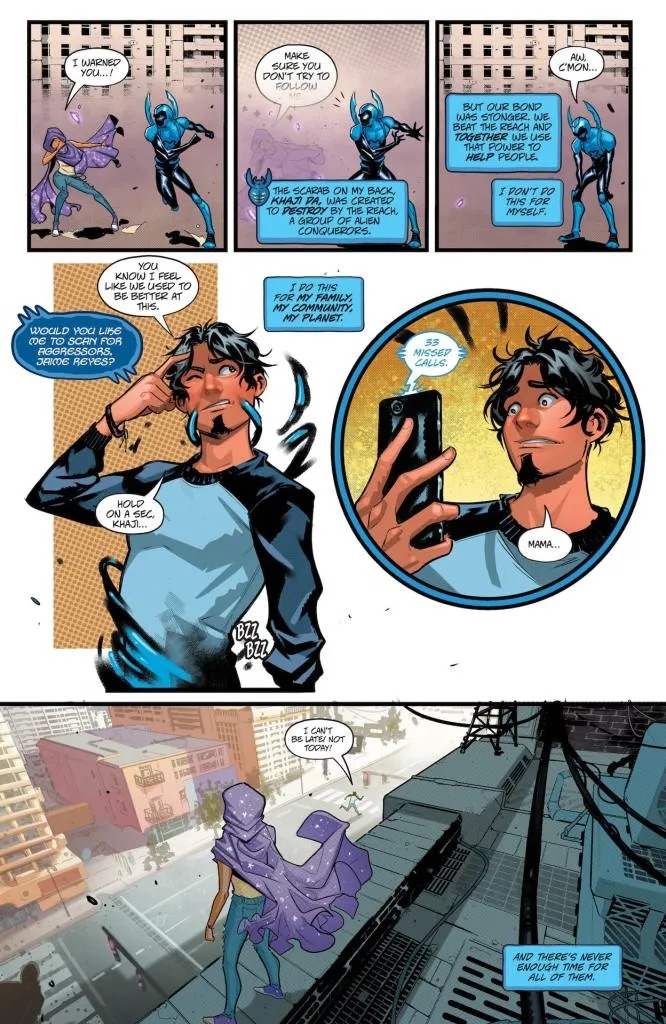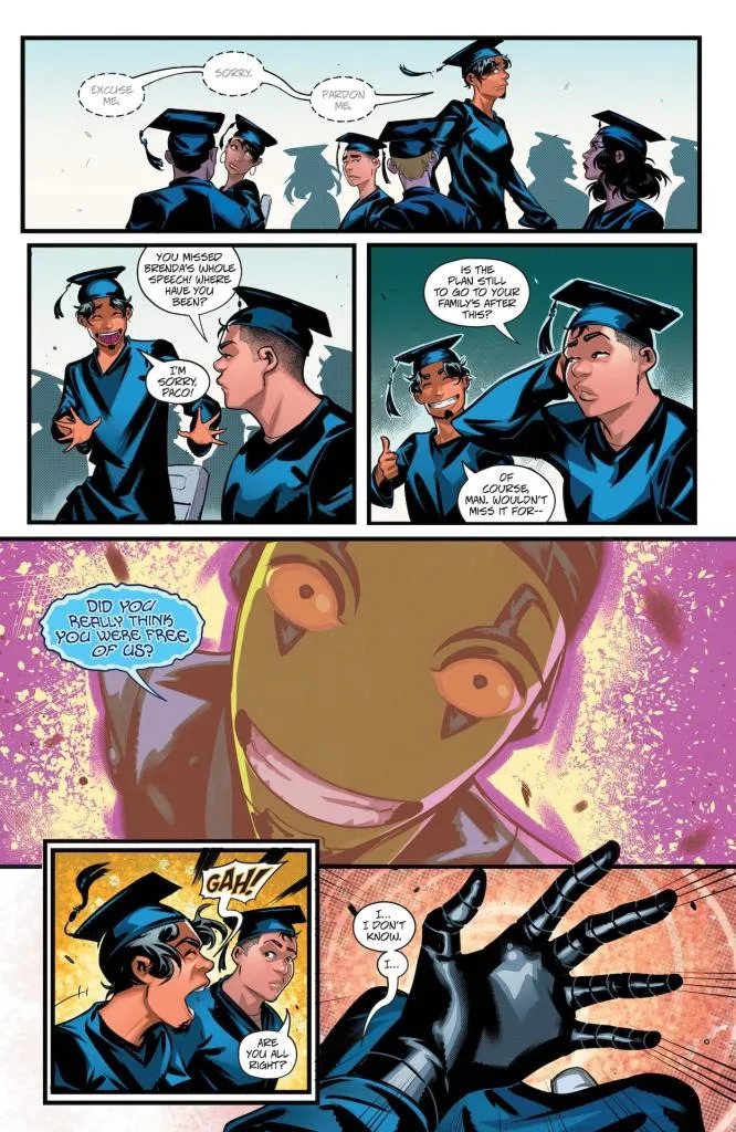 Jaime Reyes has a lot to juggle. Whether it’s his finals for senior year or a new villain tearing up El Paso, Jaime is always torn between two worlds. But when his worlds come crashing together at his high school graduation, nothing will ever be the same. A message from the Reach bombards Jaime’s scarab, Khaji Da, and it starts throwing off his connection to the device. And as if that wasn’t enough, Jaime’s parents and friends are pressuring him about his next steps in life. But what’s hidden here on Earth that’s drawing the Reach back? And where did this new Fadeaway Man come from? Can Jaime find balance in his life and rise to become a true hero, or is it curtains for Blue Beetle?