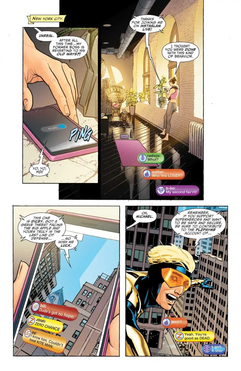 Desperate to regain the spotlight, Booster Gold looks to attract the public’s (and Justice League’s) attention the same way any washed-up, second-rate hero would-social media. The not-so-tech-savvy hero from the 25th century enlists the help of his best friend, Blue Beetle, who possesses both the money and the brains to help his old pal navigate the scary world of internet influencers. Watch out, evildoers, our heroes are live and online!