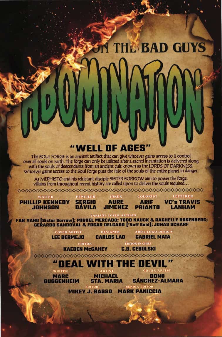 THE DEVIL MADE HIM DO IT… Emil Blonsky is never one to turn down a good deal. Whether it’s to fell the mighty GROOTSLANG in exchange for his freedom from a Wakandan prison, or to collect a soul on behalf of MEPHISTO for a mystery boon. THE ABOMINATION is always the monster for the job, and he’s going to prove it once and for all.
