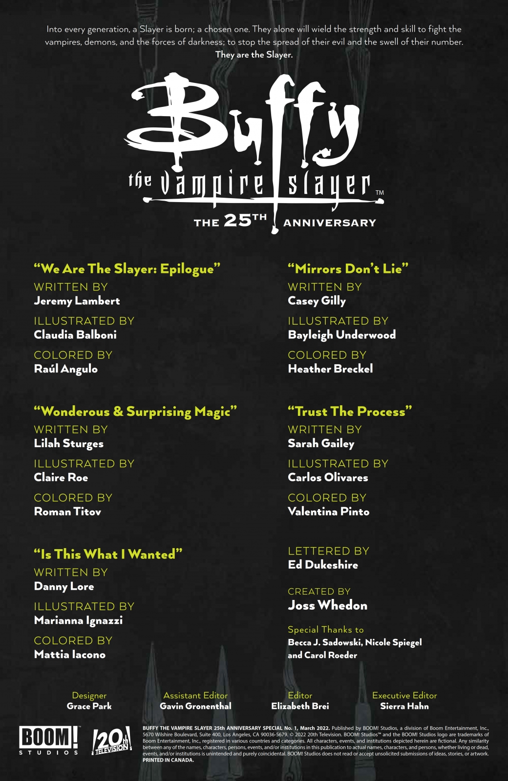 SPECIAL ISSUE. 25 years later, dive into a whole new universe of stories celebrating the phenomenal icon of a generation, Buffy Summers! Where in the Multiverse is Buffy? And what’s happened to the Scooby Gang? Find out in the surprising epilogue to BOOM! Studios’ acclaimed first three years of Buffy the Vampire Slayer! Discover the start of an all new series about the Slayer from Hugo Award-winning author Sarah Gailey (Eat the Rich, Magic for Liars)! Plus, three brand new original stories about your fan favorites from the Buffyverse in this 64 page perfect bound deluxe special celebrating the pivotal anniversary of the Slayer!