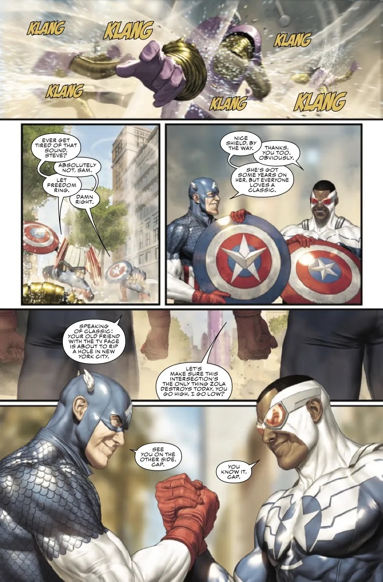 When Arnim Zola launches a catastrophic attack on New York City, he meets his match—in Sam Wilson and Steve Rogers! In the explosive battle that follows, two Captain Americas prove better than one, and Sam and Steve decide they might just keep a good thing going… Tochi Onyebuchi (BLACK PANTHER LEGENDS), Jackson Lanzing & Collin Kelly (KANG THE CONQUEROR) and Mattia De Iulis (THE MIGHTY VALKYRIES, INVISIBLE WOMAN) kick off an incredible new CAPTAIN AMERICA saga—you won’t want to miss what comes next!