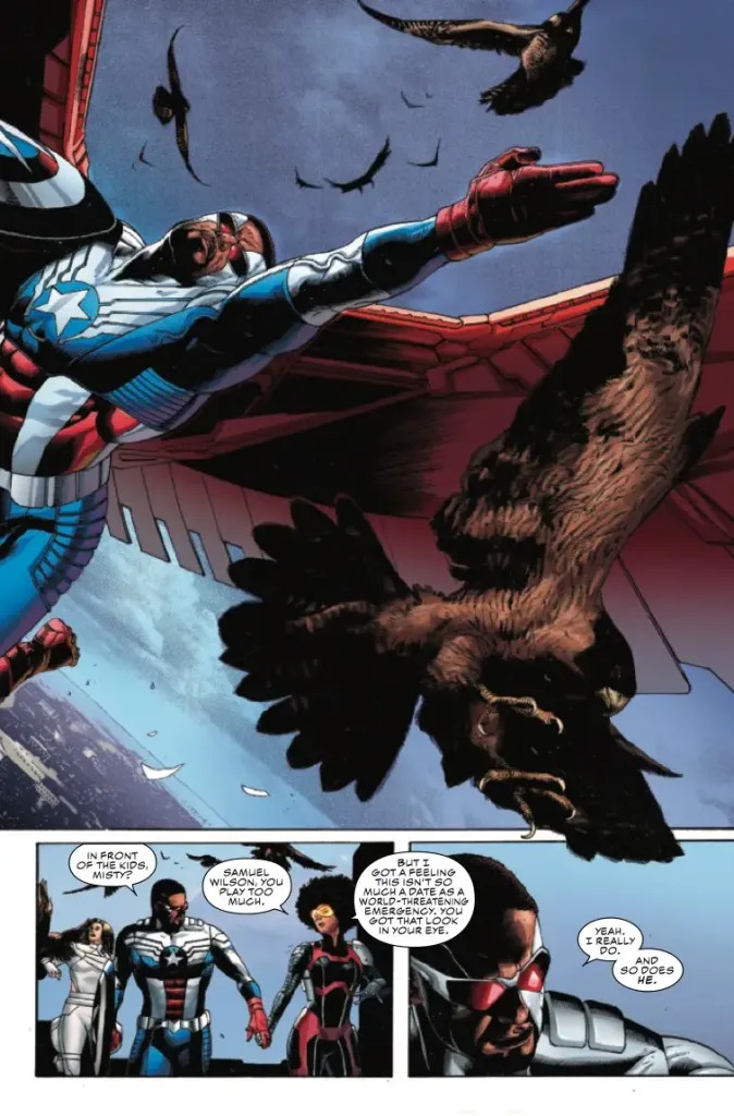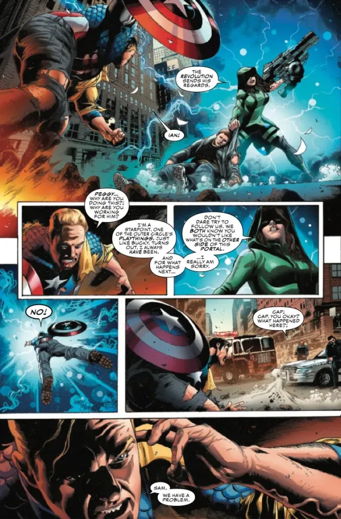 THE REVOLUTION STARTS HERE! Bucky Barnes is the Outer Circle’s New Revolution, and he has enacted his deadliest move yet—an alliance with Sam Wilson’s nemesis, the White Wolf. When Steve Rogers’ adopted son, Ian, A.K.A. Nomad, is abducted by someone Steve thought was a friend, he suspects Bucky’s hand at work and calls upon the people who know Ian best—Sam Wilson, Sharon Carter and Misty Knight—to help him get to the bottom of the attack. Has Bucky finally gone too far? Why has Nomad been taken, and what does it have to do with a portal to Dimension Z opening over a secret battleground in Alaska? The Symbol of Truth and the Sentinel of Liberty reunite for a pulse-pounding crossover event that will make them question everything they believe in…and each other.