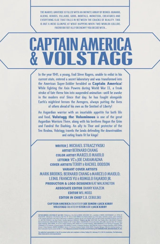 J. MICHAEL STRACZYNSKI’S TEAM-UP EVENT CONTINUES AS VOLSTAGG RECRUITS THE SENTINEL OF LIBERTY! When a war breaks out in the Nine Realms, Volstagg of the Warriors Three turns to the only man skilled enough to end it: Steve Rogers, Captain America! JMS teams with visionary artist Bernard Chang for the second in a series of one-shots bringing unlikely Marvel characters together for tales unlike any other!